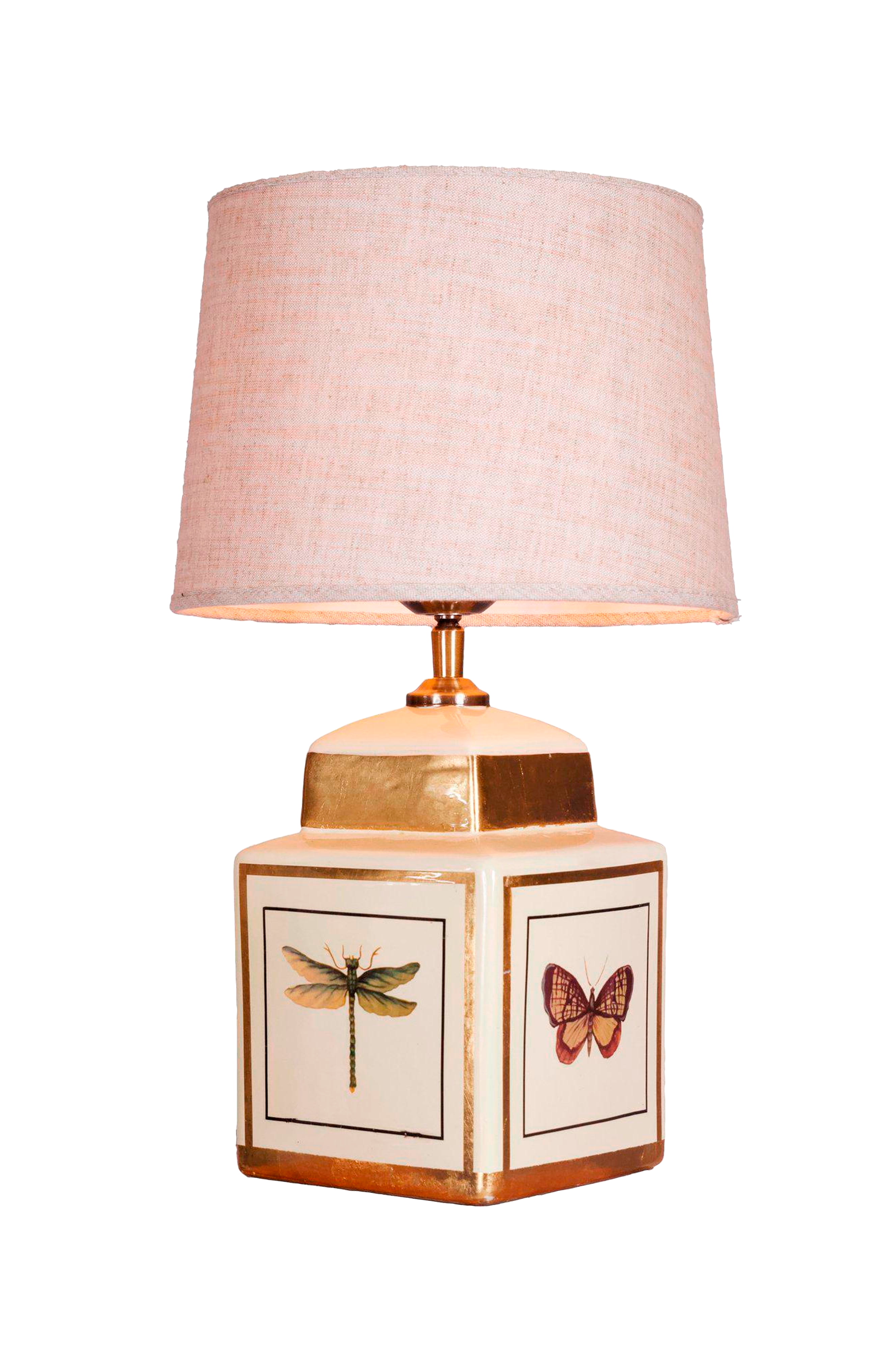 Tämä koristeellinen pöytävalaisin tuo taiteellista charmia pienemmässä muodossa - pehmeän keltaisen sävyinen keraaminen pohja, jota koristavat käsin maalatut pastelliperhoset ja hohtavat kultaiset aksentit. Neliön muotoinen siluetti antaa valaisimelle selkeän, strukturoidun ilmeen, kun taas herkät värit ja motiivit tuovat lämpöä ja leikkisyyttä. Hienostunut sekoitus muotoilua ja persoonallisuutta, joka sopii täydellisesti yöpöydälle, ikkunalaudalle tai lukunurkkaukseen. Valaisimen korkeus on 45 cm ja varjostimen halkaisija 25 cm, joten valaisin on pienikokoinen ja helposti sijoitettava, mutta tyylistä ei tingitä. Siinä on e27-pistorasia (max 40w), ja sen mukana toimitetaan 180 cm pitkä musta tekstiilijohto, jossa on eu-pistoke. Kytkin on sijoitettu 50 cm:n päähän jalustasta, jotta siihen pääsee kätevästi käsiksi. Valonlähde myydään erikseen. Pieni valaisin, jolla on rohkea läsnäolo - ihanteellinen tuomaan ripauksen charmia ja yksilöllisyyttä mihin tahansa tilaan.