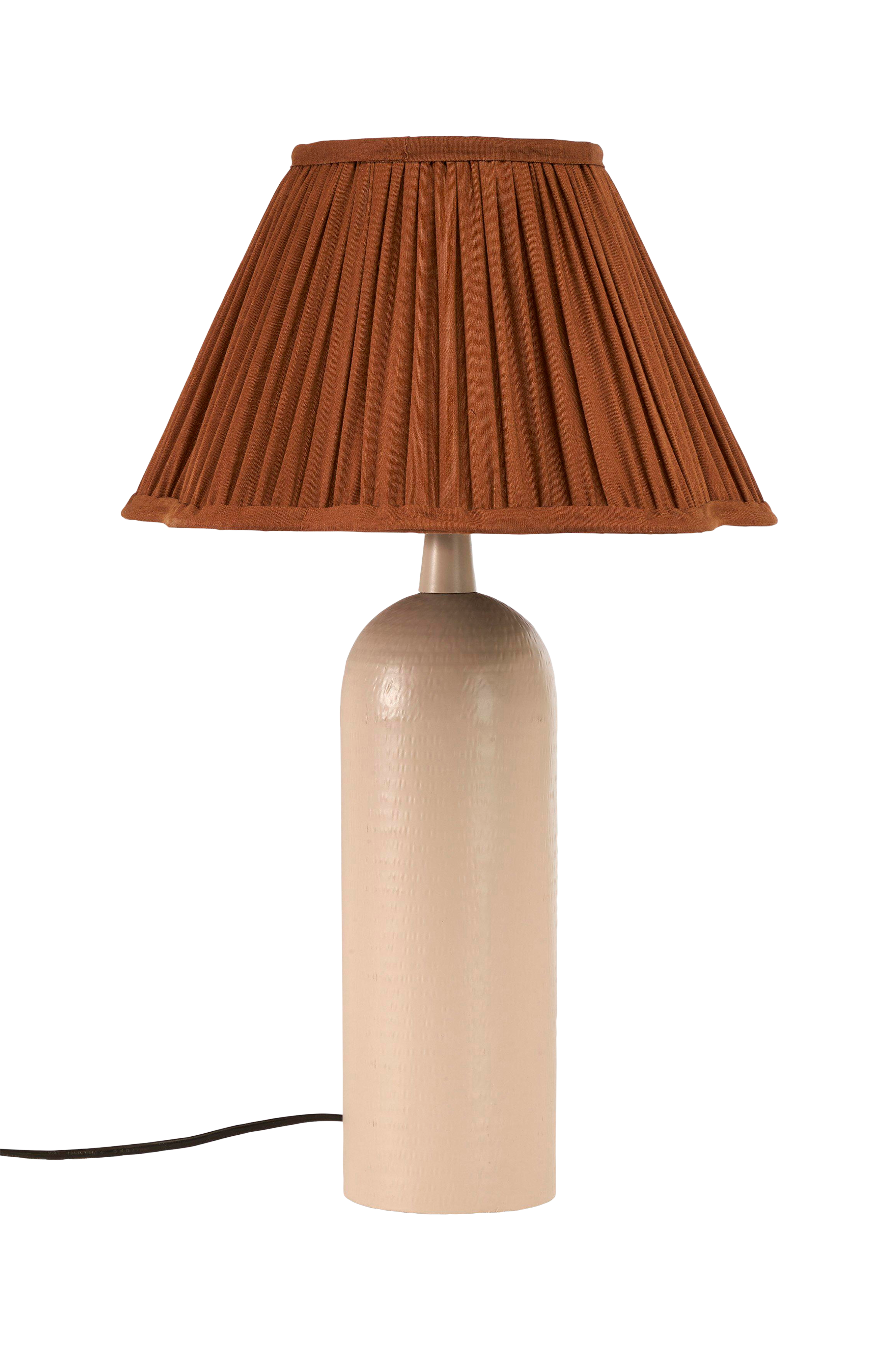 Klassinen pöytävalaisin, joka on helppo sijoittaa ja sopii moniin erilaisiin ympäristöihin, niin moderniin/trendikkääseen kuin levolliseen ja maalaishenkiseen kotiin. Lampunjalka metallia, jossa taottu rakenne. Varjostin silkinnäköistä rypytettyä kangasta. Sen aaltomainen alareuna saa valon leviämään kauniisti. 170 cm:n muovijohto, jossa virtakytkin. E27-rengaskiinnike.
