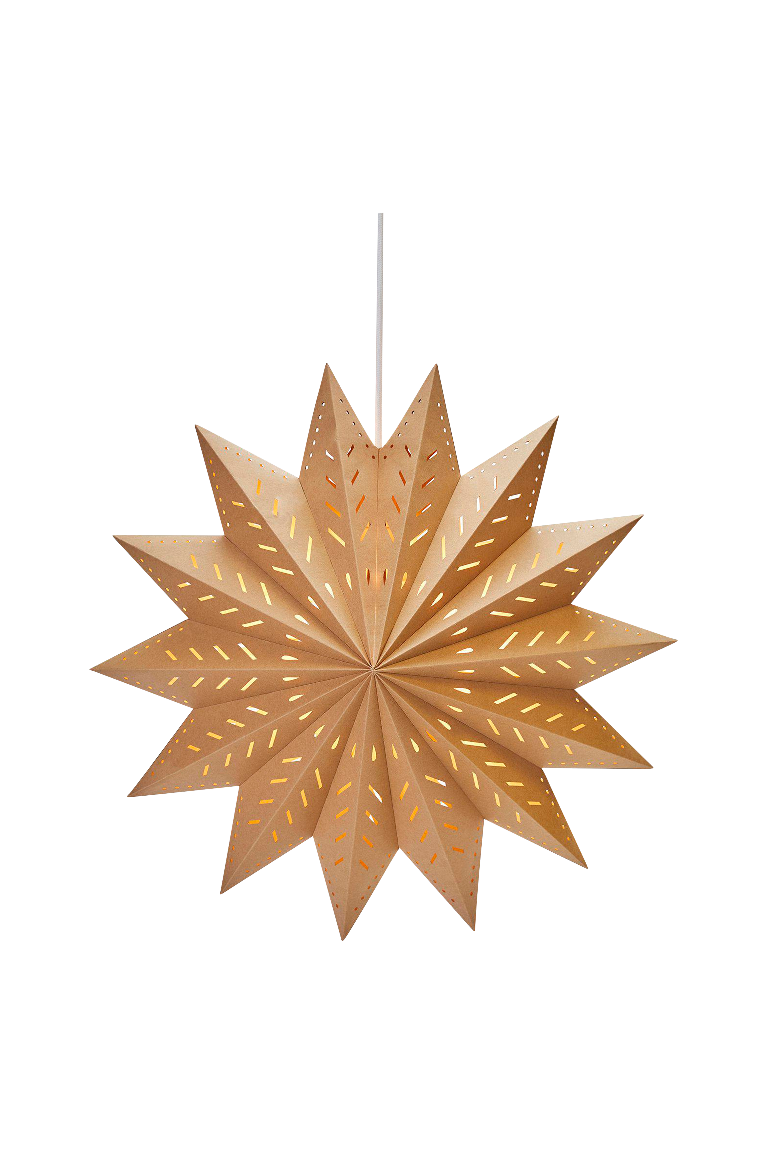Tukevasta paperista valmistettu tähti, jonka aukot siivilöivät kauniisti valoa. Tähti suljetaan nyörille ja stopperilla. Tilaa erikseen E14-johto ja enintään 25 watin valonlähde. Korkeus 50 cm, leveys 50 cm ja syvyys 43 cm. Valonlähde ei sisälly toimitukseen.