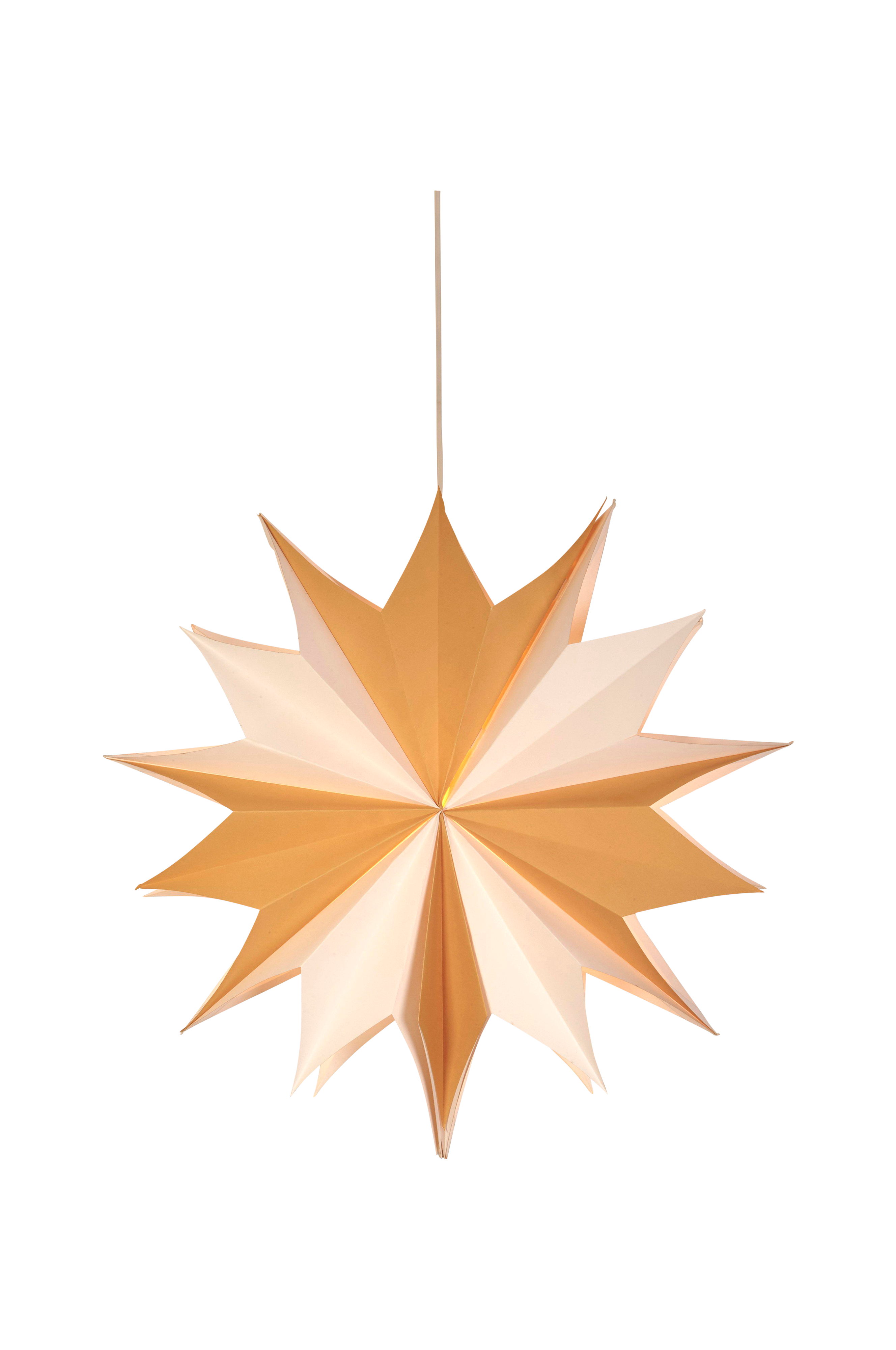 Valotähti on valmistettu paksuhkosta paperista. Sisemmän tähden lävistetyt reiät siivilöivät valon kauniilla tavalla. Suljetaan tarranauhalla ja solmimisnauhoilla. Korkeus 60 cm, leveys 60 cm, syvyys 21 cm. Tilaa lisäksi E14-lampunpidike ja valonlähde.