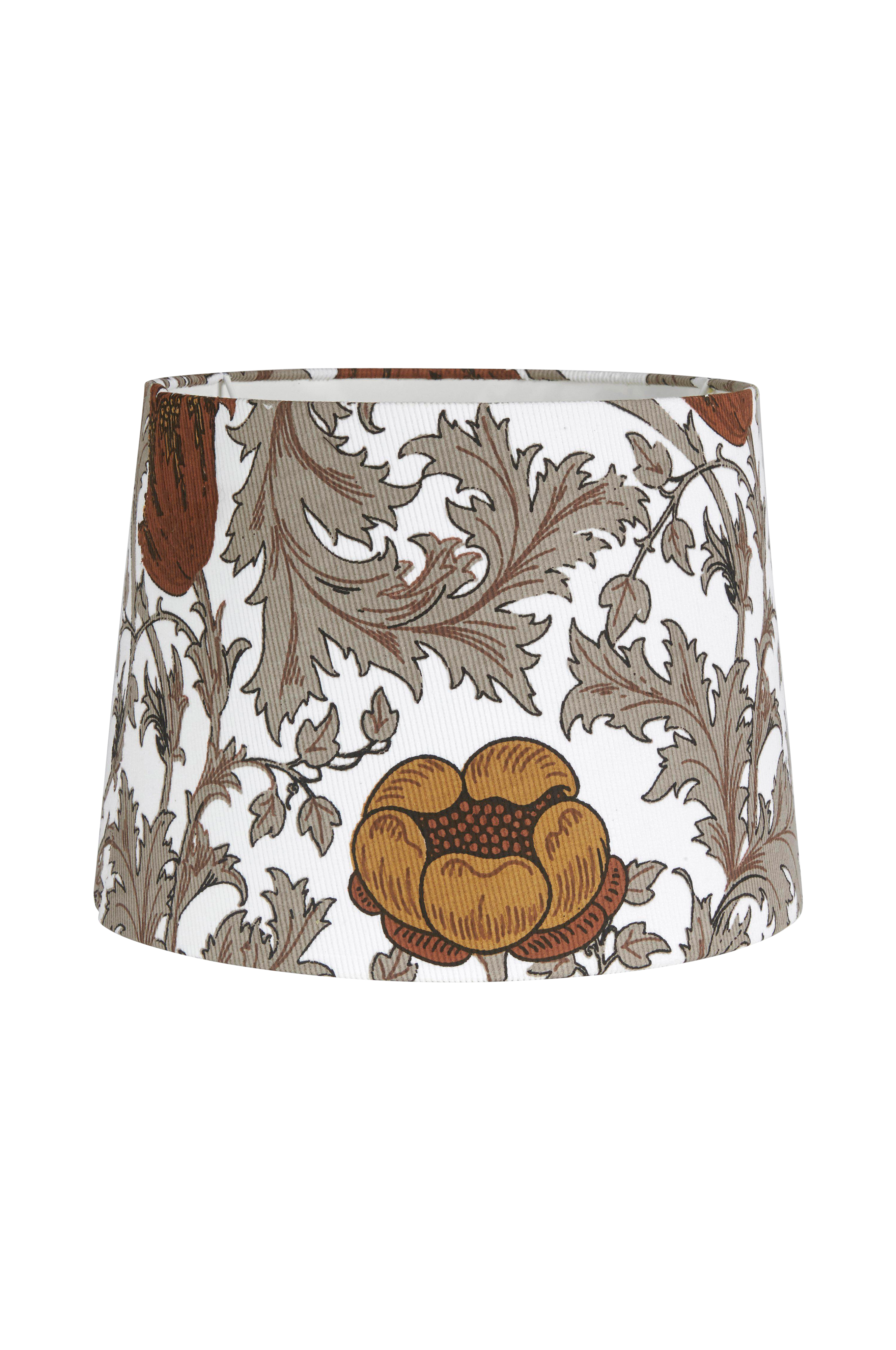 Sofia-varjostin vakosamettia, jossa kaunis kuvio. Pyöreä varjostin, jossa E27-rengaskiinnike. Korkeus 18 cm, leveys alhaalta 25 cm, leveys ylhäältä 22 cm.