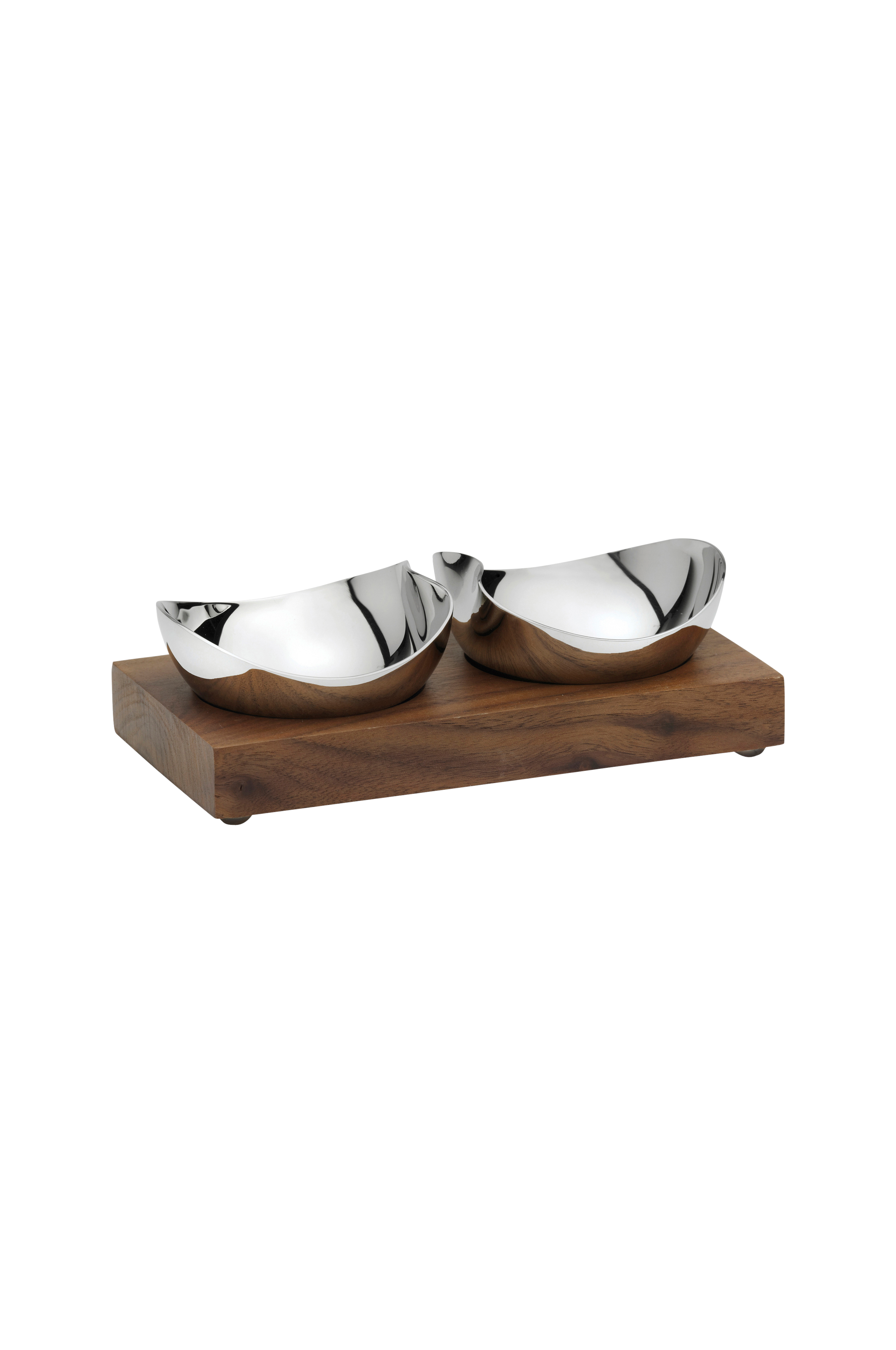 2 Pinch-kulhoa korkealaatuista 18/10 ruostumatonta terästä lakatulla pähkinäpuisella alustalla. Kulhot sopivat täydellisesti mausteille, dippikastikkeille tai öljyille.