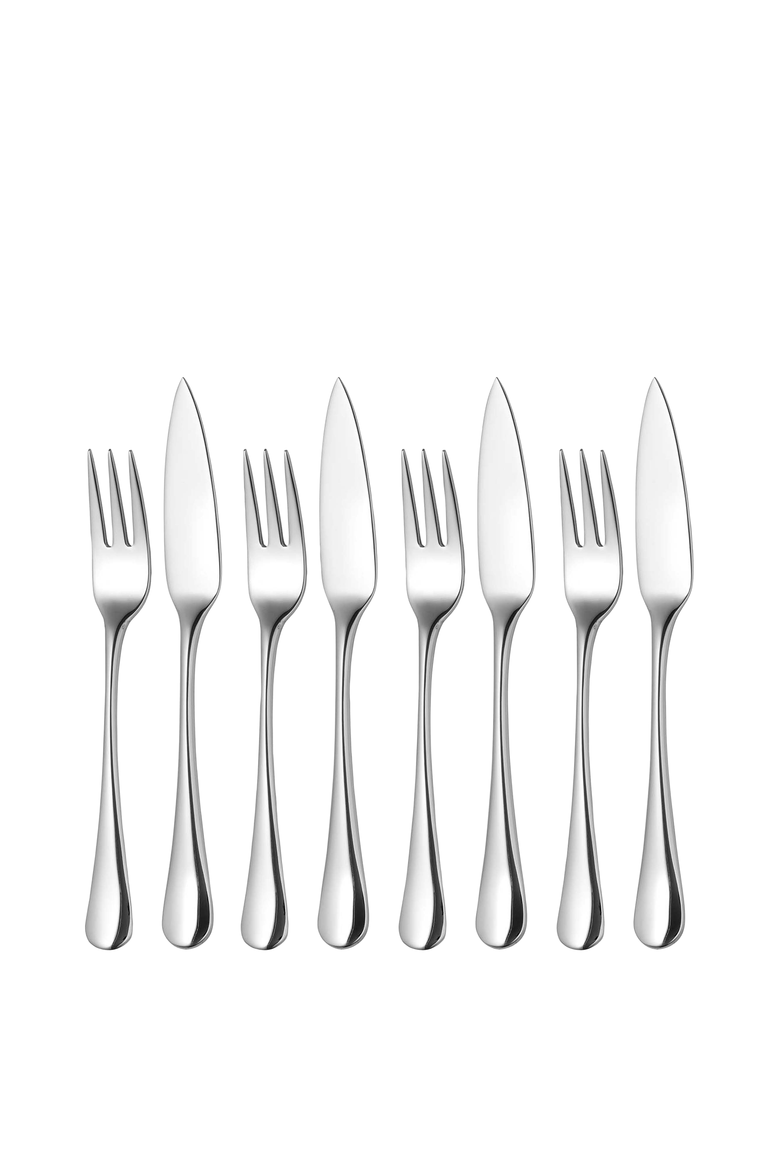 Setti sisältää 4 kalaveistä ja 4 kalahaarukkaa, jotka kuuluvat Radford Bright -sarjaan. Valmistettu laadukkaasta ruostumattomasta 18/10-teräksestä, jossa on peilikiillotettu pinta. Veitsien terät on valmistettu karkaistusta ruostumattomasta erikoisteräksestä, mikä takaa parhaan mahdollisen leikkuutehon. Kaikki osat ovat konepesun kestäviä ja niillä on elinikäinen takuu. Kalaveitsen pituus 21,9 cm. Kalahaarukan pituus 19,3 cm.