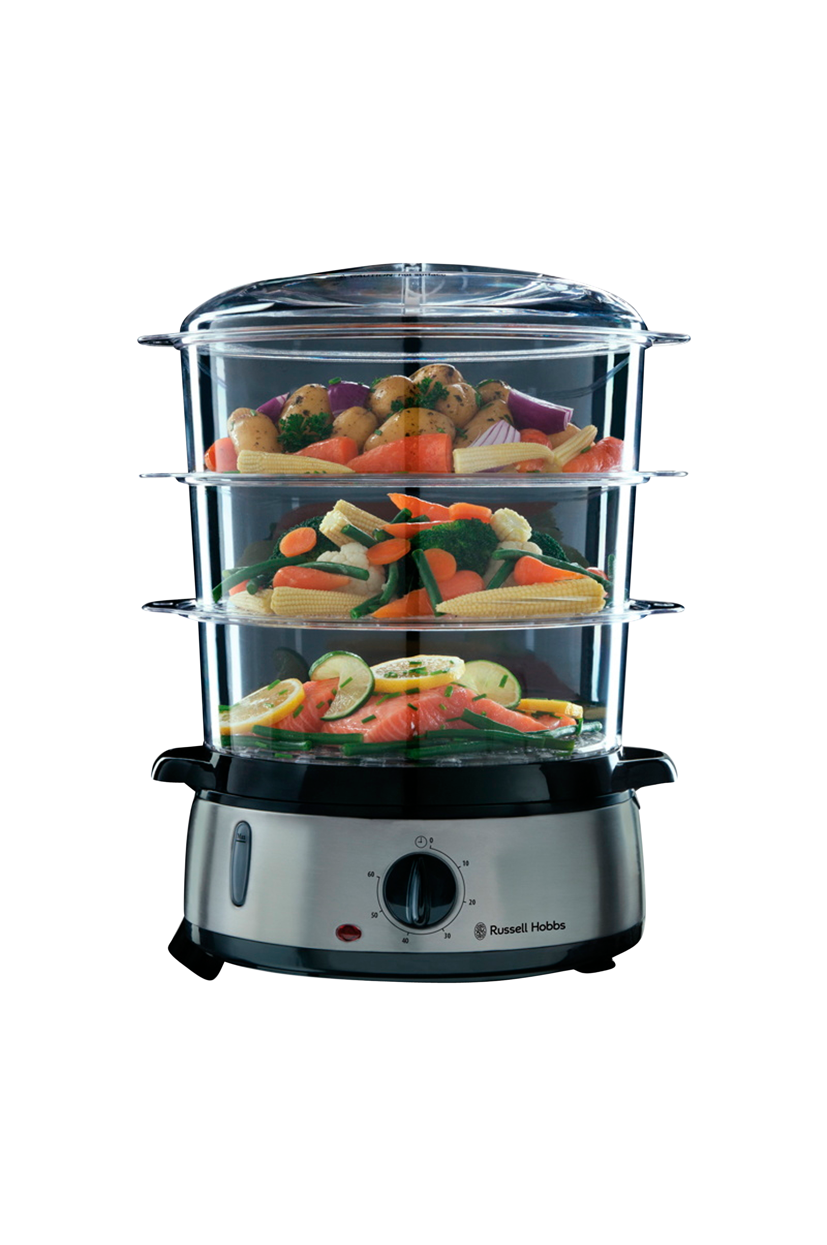Fiksu höyrykeitin, jolla valmistat terveellistä ruokaa. Höyryllä kypsyttäminen säilyttää ruoka-ainesten ravintoaineet ja vitamiinit. Kolme höyrytysastiaa, joissa voit kypsentää samanaikaisesti eri ruoka-aineita, kuten riisiä, vihanneksia ja kalaa.