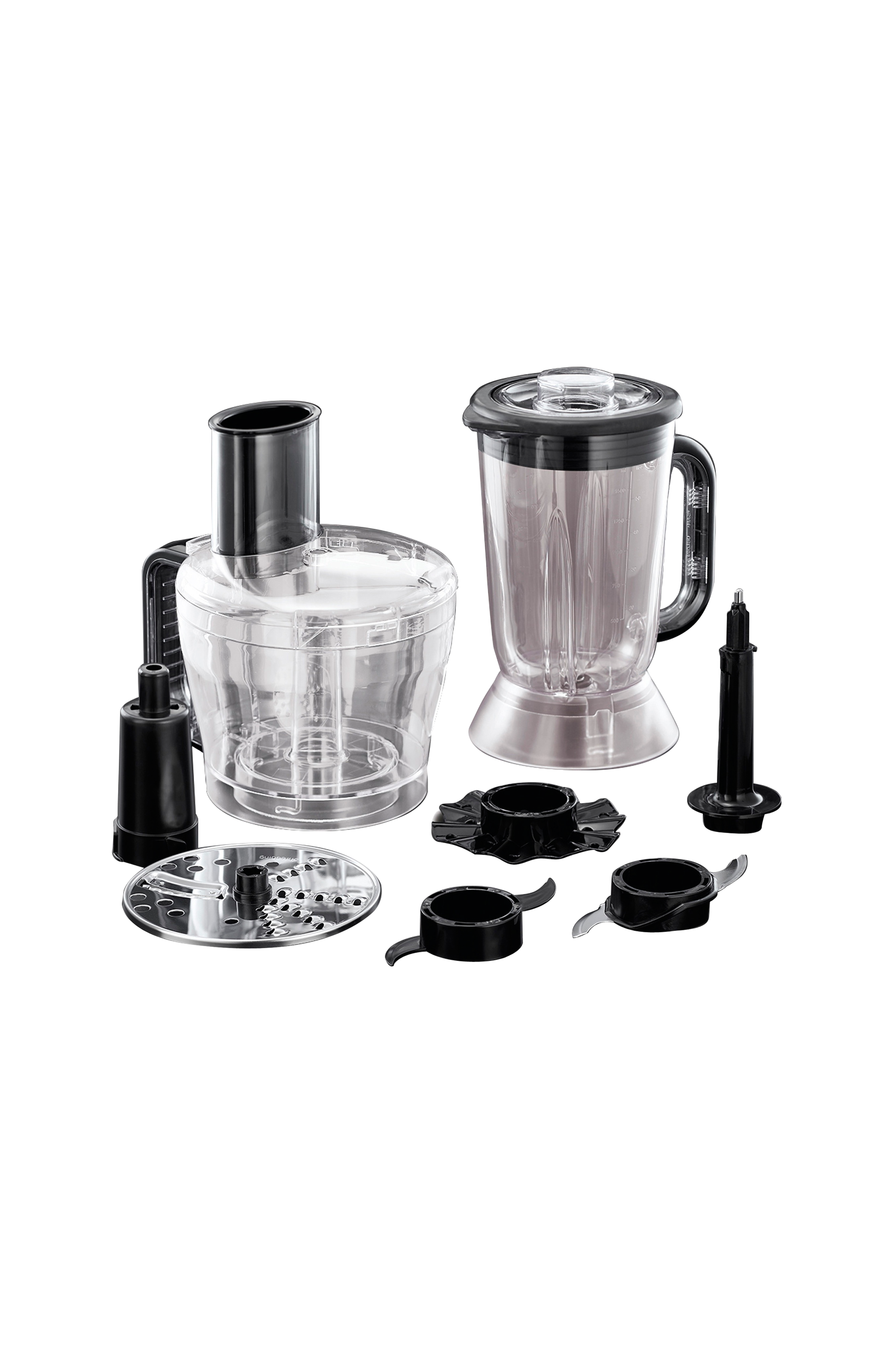 Mukana: Terät ruostumatonta terästä, viipalointi- ja suikalointiterät, taikinakoukku ja soseutusterä. 1,5 litran muovinen tehosekoitinkannu