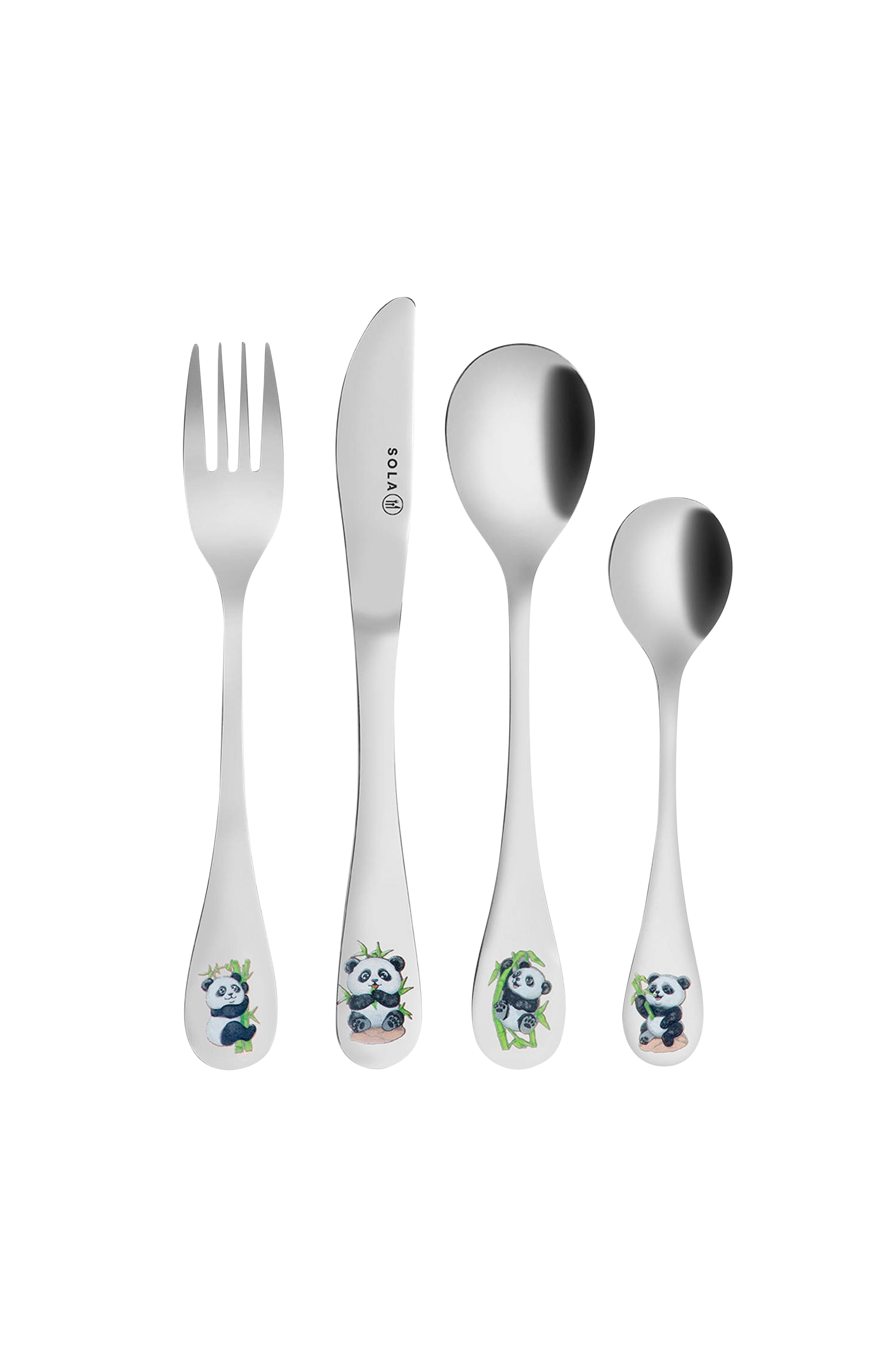 Solan hieno 4-osainen lasten aterinsarja. Aterimet ovat laadukasta 18/10 ruostumatonta terästä ja toimitetaan hienossa lahjapakkauksessa.