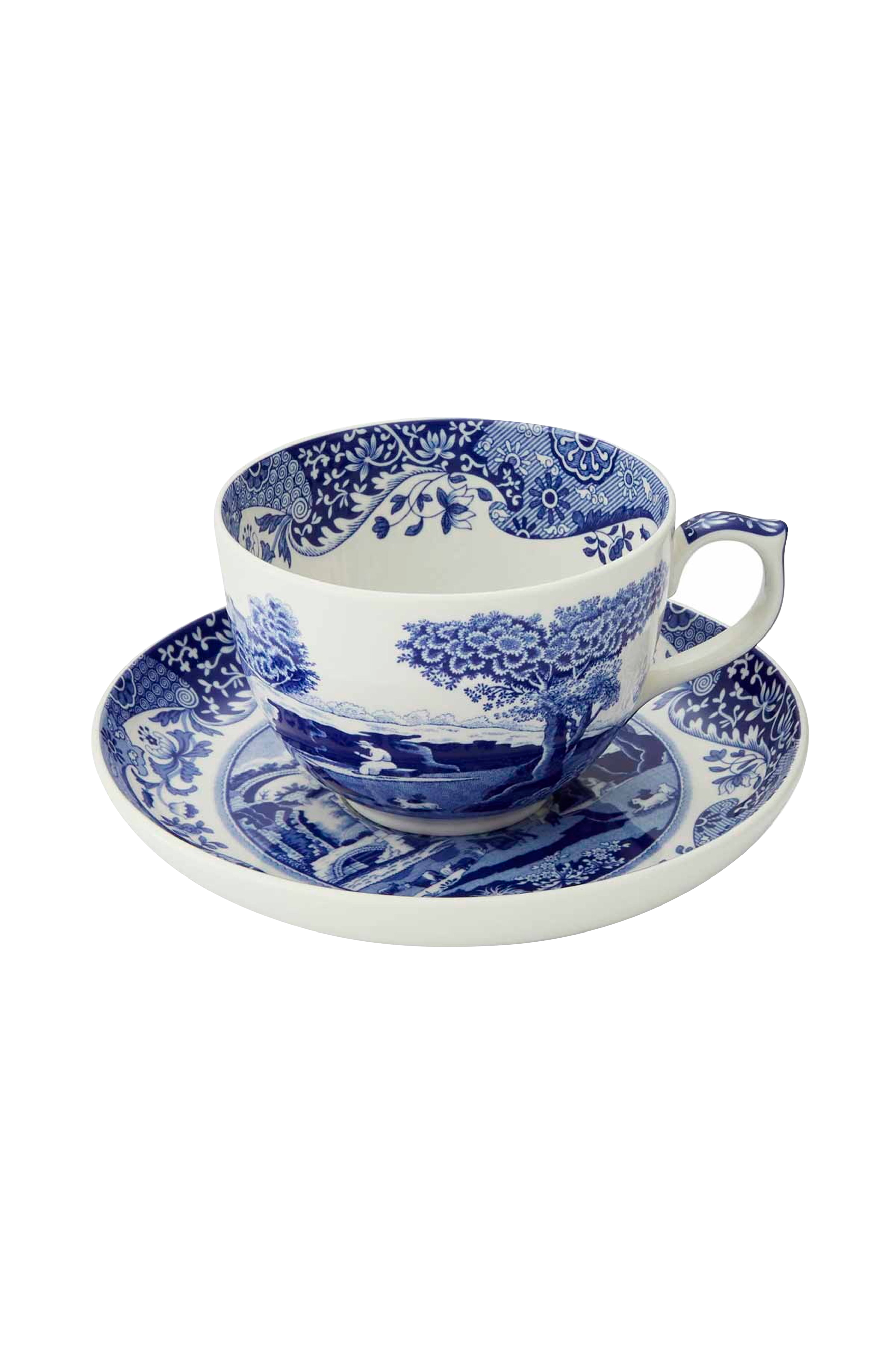 Maailmankuulun Blue Italian -sarjan iso kuppi ja aluslautanen. Yksityiskohtainen kuvio on vanhan italialaisen maaseudun inspiroima. Vetoisuus 56 cl.