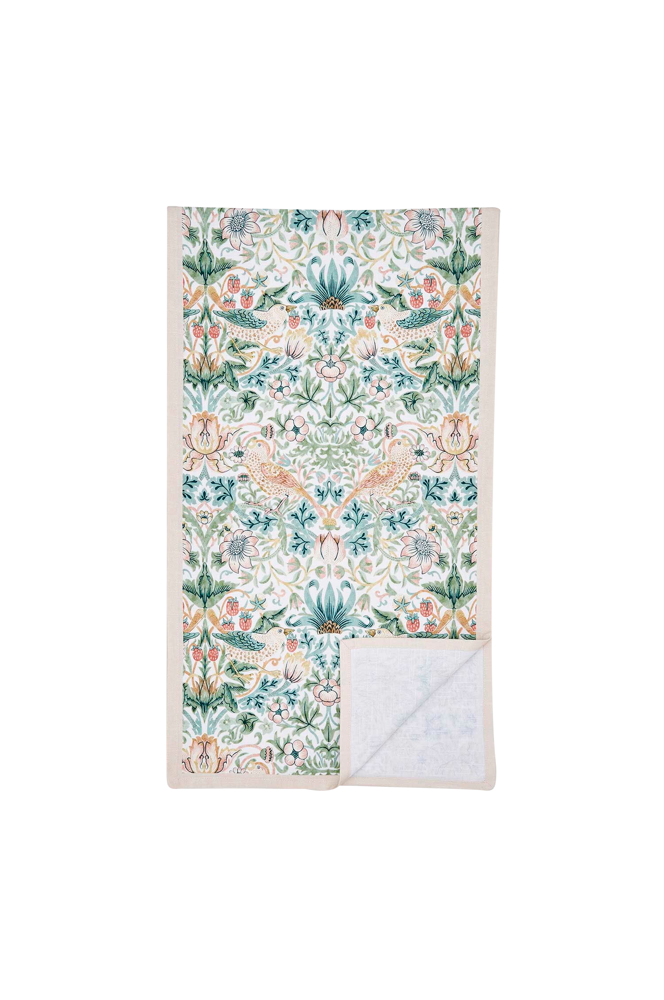 Spodes Morris & Co -malliston kaunis kaitaliina, jossa on roosan ja vihreän sävyinen, ikoninen Strawberry Thief -kuvio ja reunoja kiertävä boordi. 100% puuvillaa. Yhdistä saman malliston pöytäliinaan ja lautasliinoihin.