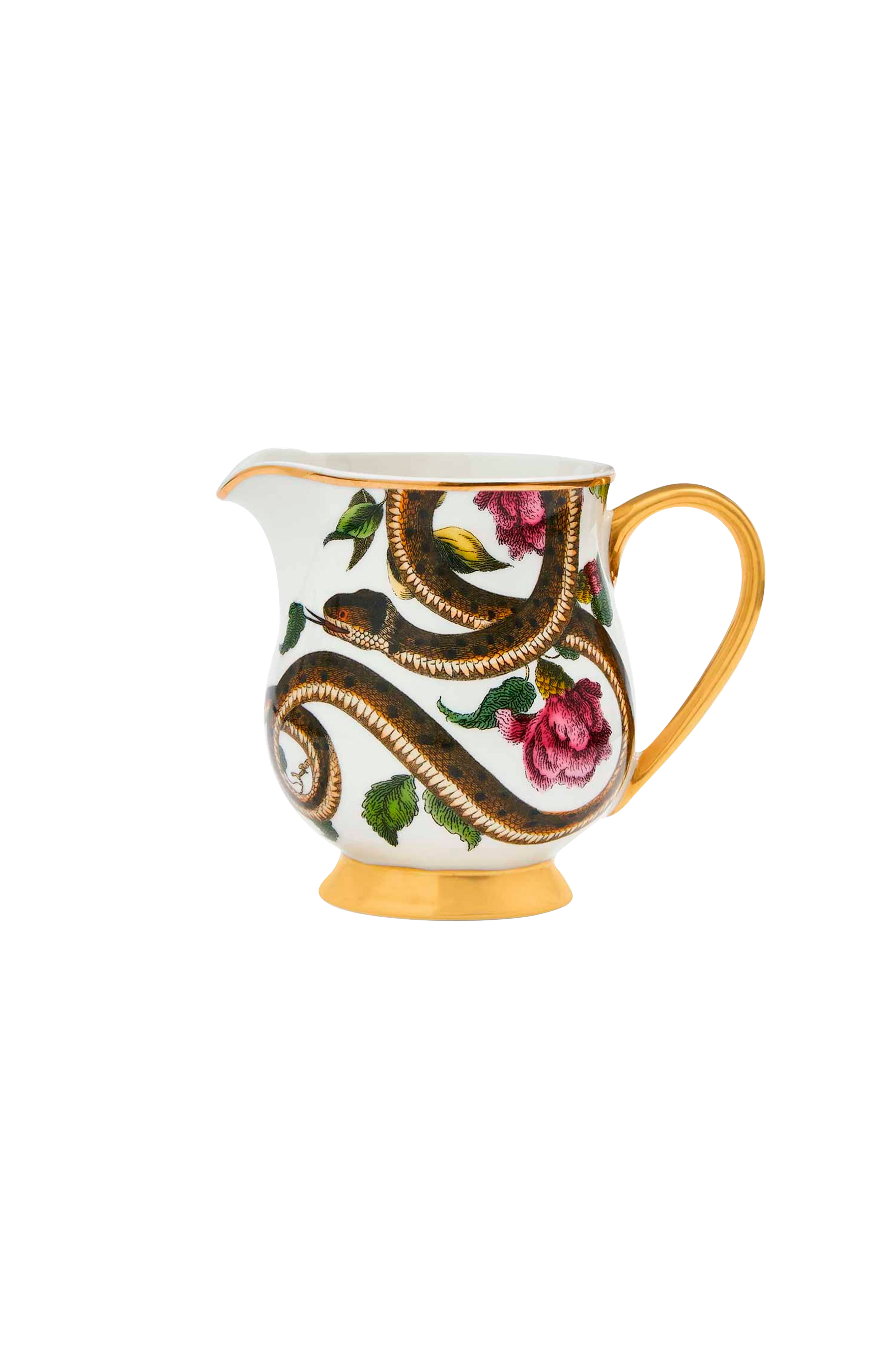 Spoden Creatures of Curiosity -malliston maitokannu, jossa luonnon inspiroima fantastinen kuvio. Kannussa on käsinmaalatut yksityiskohdat, ja se on valmistettu ylellisestä luuposliinista. Kahva on maalattu 22 karaatin kullalla.