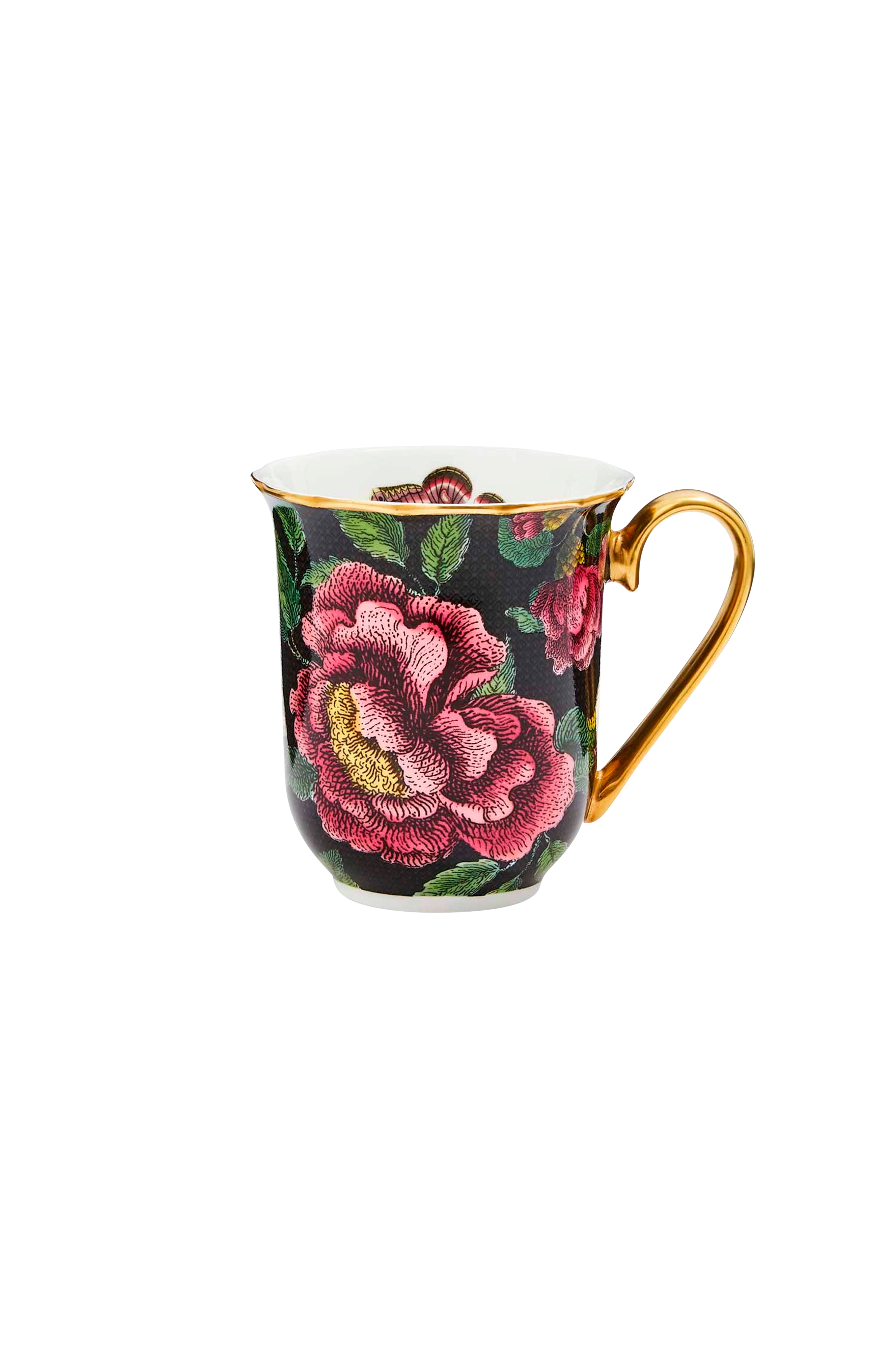 Spoden Creatures of Curiosity -malliston kukallinen muki, jossa luonnon inspiroima fantastinen kuvio. Mukissa on käsinmaalatut yksityiskohdat. Ylellistä luuposliinia, yksityiskohdat kultaa.