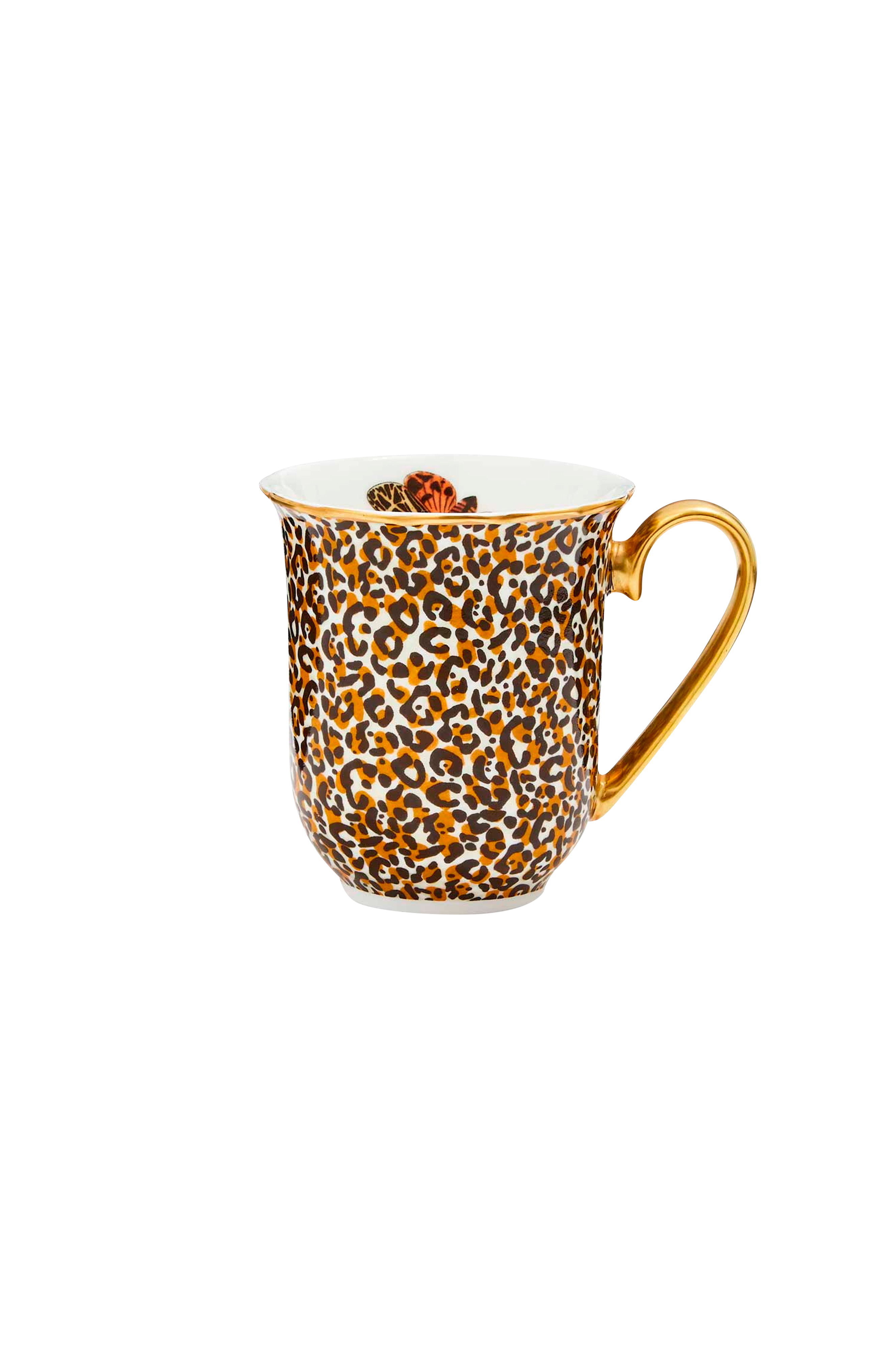 Spoden Creatures of Curiosity -malliston leopardikuvioinen muki. Ylellistä luuposliinia, yksityiskohdat kultaa.