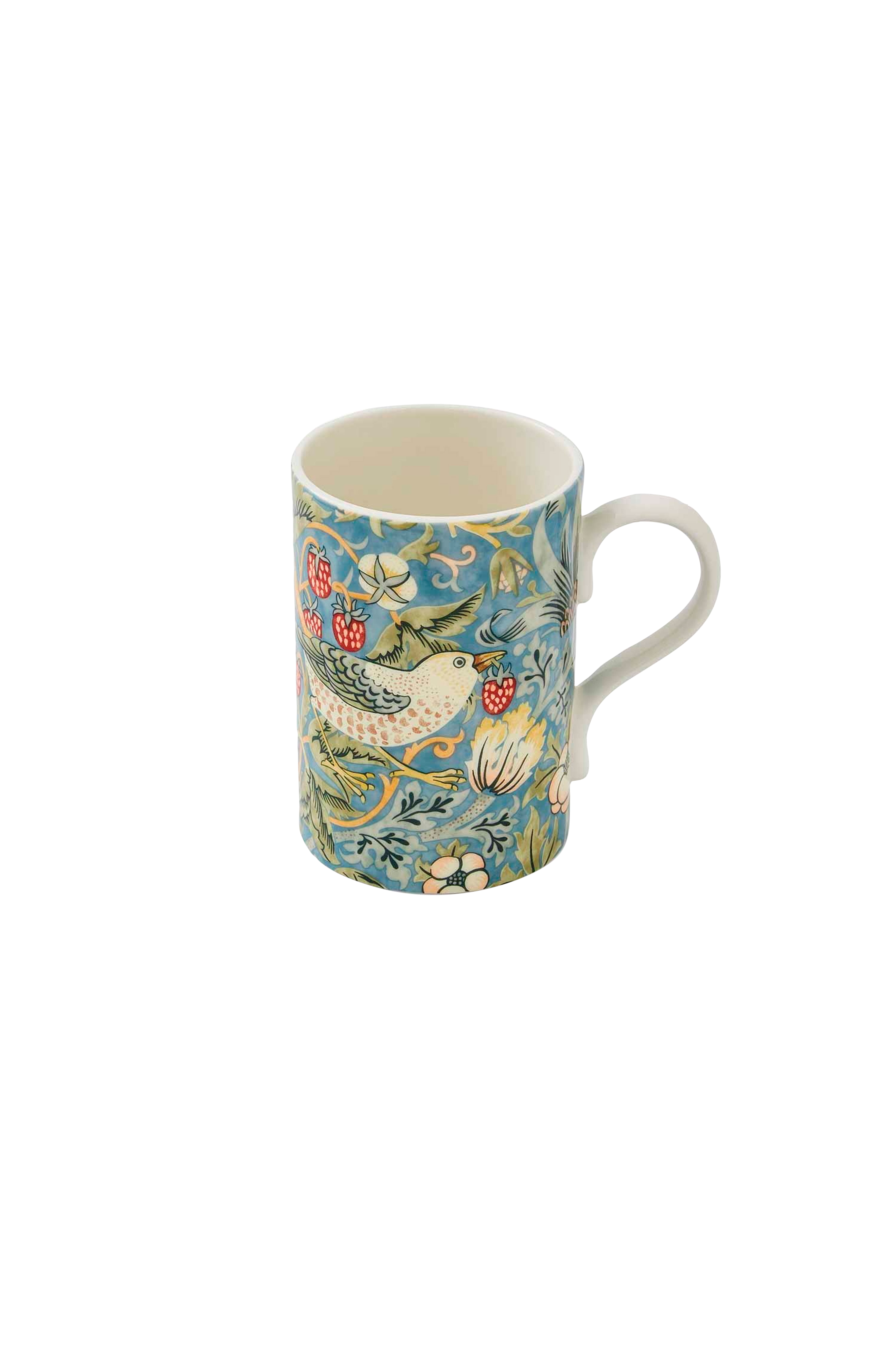 Spoden Morris & Co -malliston posliinimuki, jossa yksi William Morrisin tunnetuimpia kuvioita, Strawberry Thief.