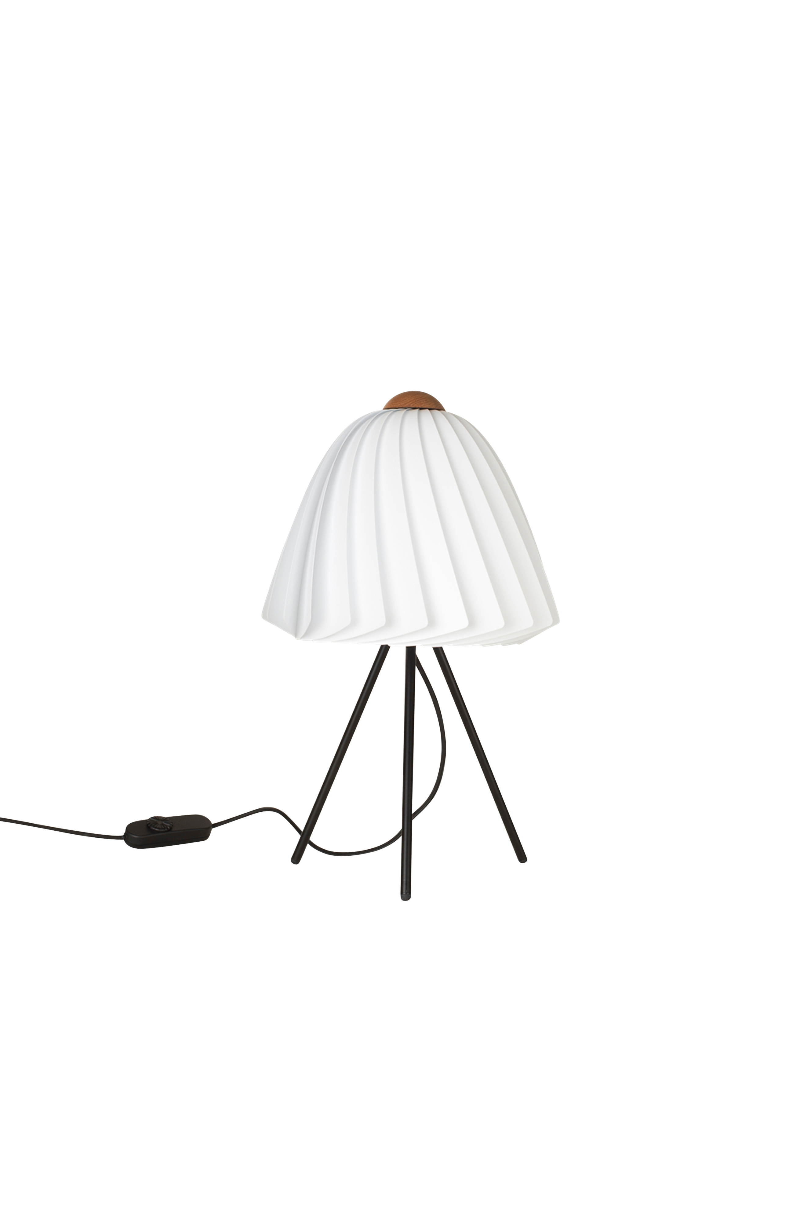Käsintehty varjostin, jossa yläosa tammea ja jauhemaalatut metallijalat. Suunnittelija Poul Christiansen.