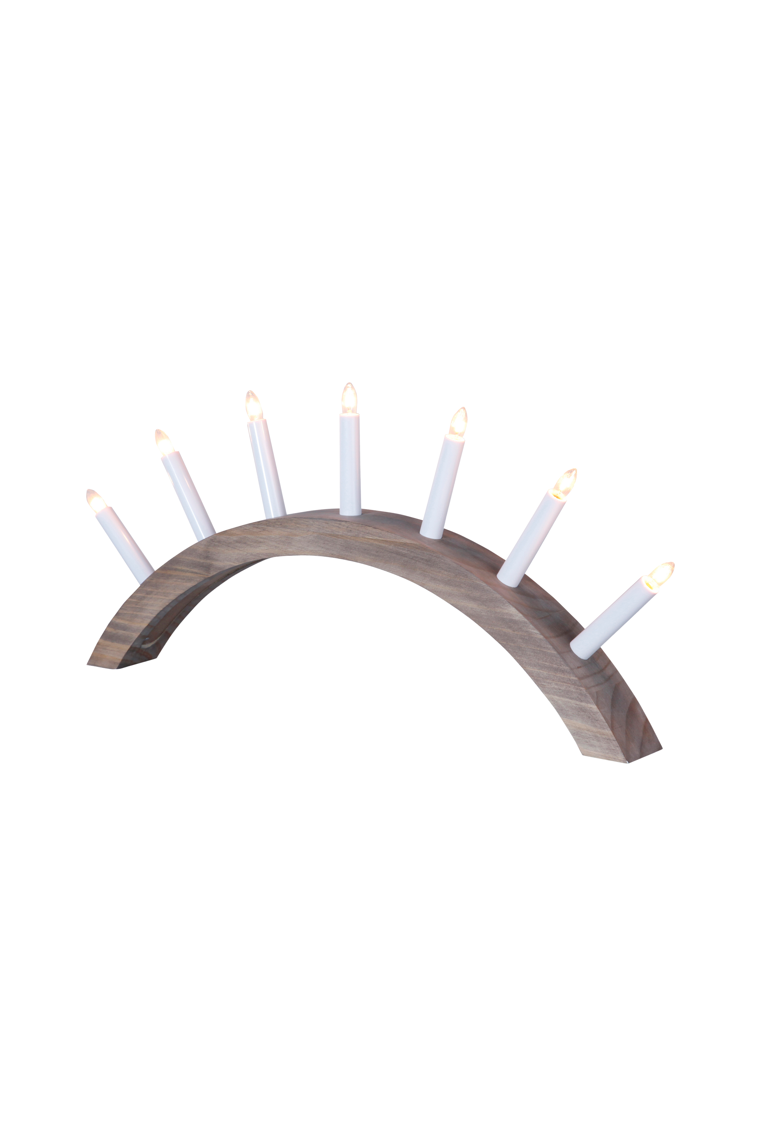 Aura-kaarisähkökynttelikkö, jossa 7 kynttilää. Korkeus 28,5 cm. Syvyys 5,5 cm. Leveys 62 cm. 1,8 m:n johto, jossa virtakatkaisin.