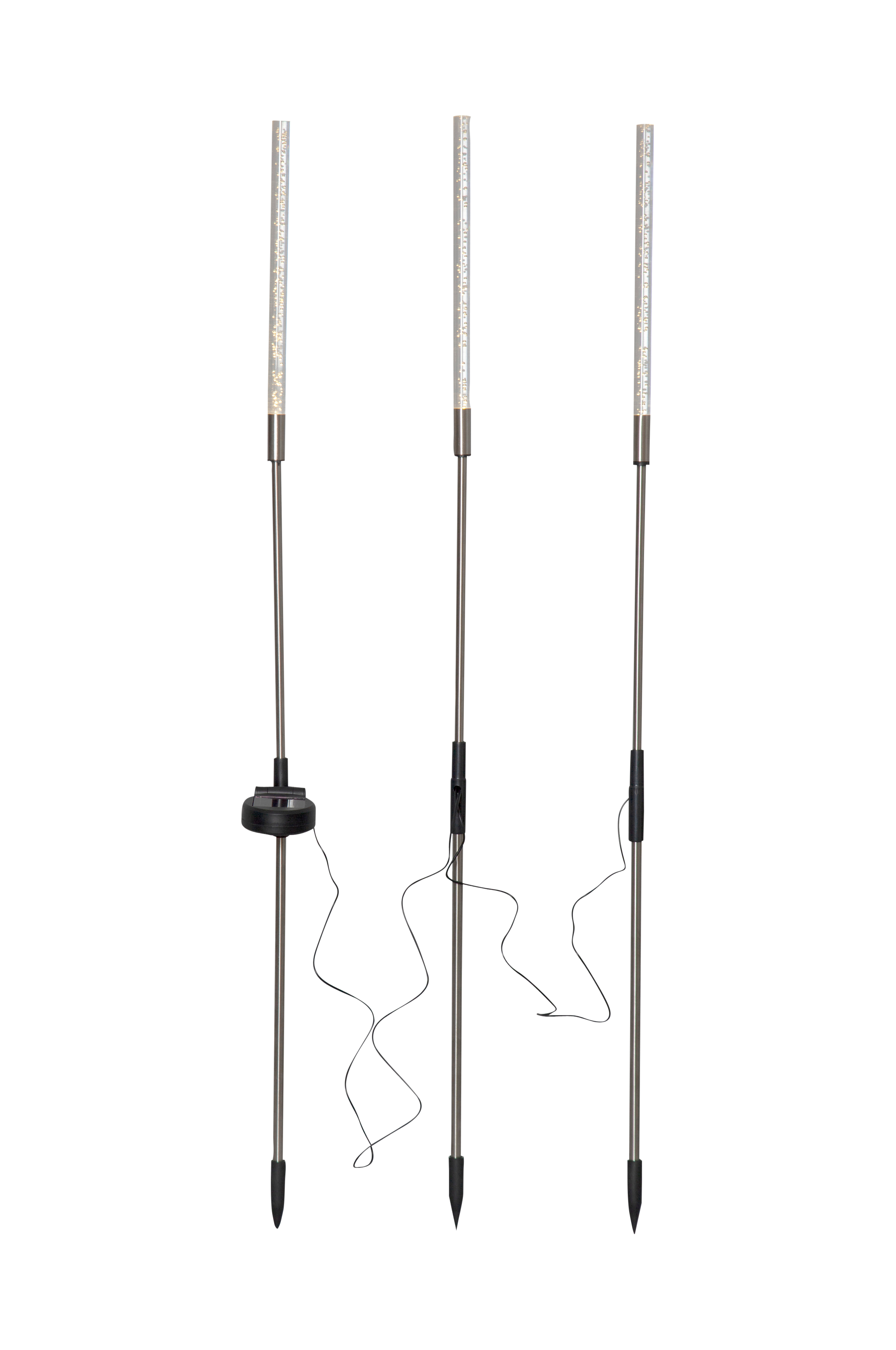 Kaunis aurinkokennolla toimiva Bubbly 3-Pin -koriste valaisee pimeällä. Aurinkokennovalaisimessa on 3 maapiikkiä, joiden korkeus on noin 80 cm ja halkaisija 1 cm. Loistavat lämpimän valkoista valoa kuplia sisältävien akryylipinnojen läpi. Kolme aurinkokennovalaisinta on yhdistetty mustalla johdolla, jonka kokonaispituus on noin 160 cm. 1. ja 2. valaisimen välillä on 90 cm ja kolmanteen valaisimeen on 70 cm. Aurinkokennokoriste sopii kauniisti koristeeksi puutarhaan tai parvekkeelle. Paneeliosaa voidaan kääntää niin, että aurinko pääsee helposti lataamaan mukana tulevan akun.
