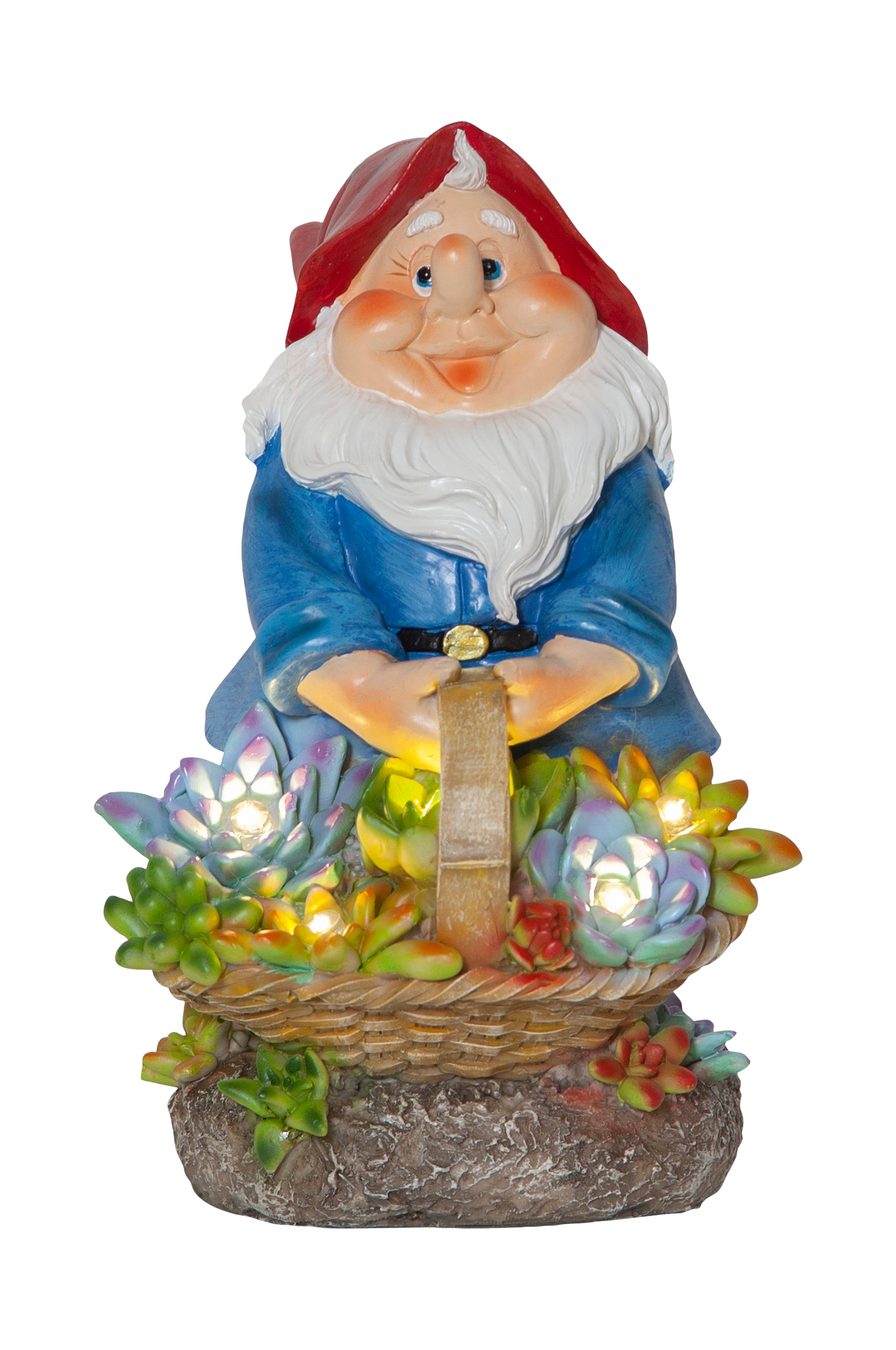 Aurinkokennokoriste, jossa pieni puutarhatonttu pitää kukkakoria kädessä.