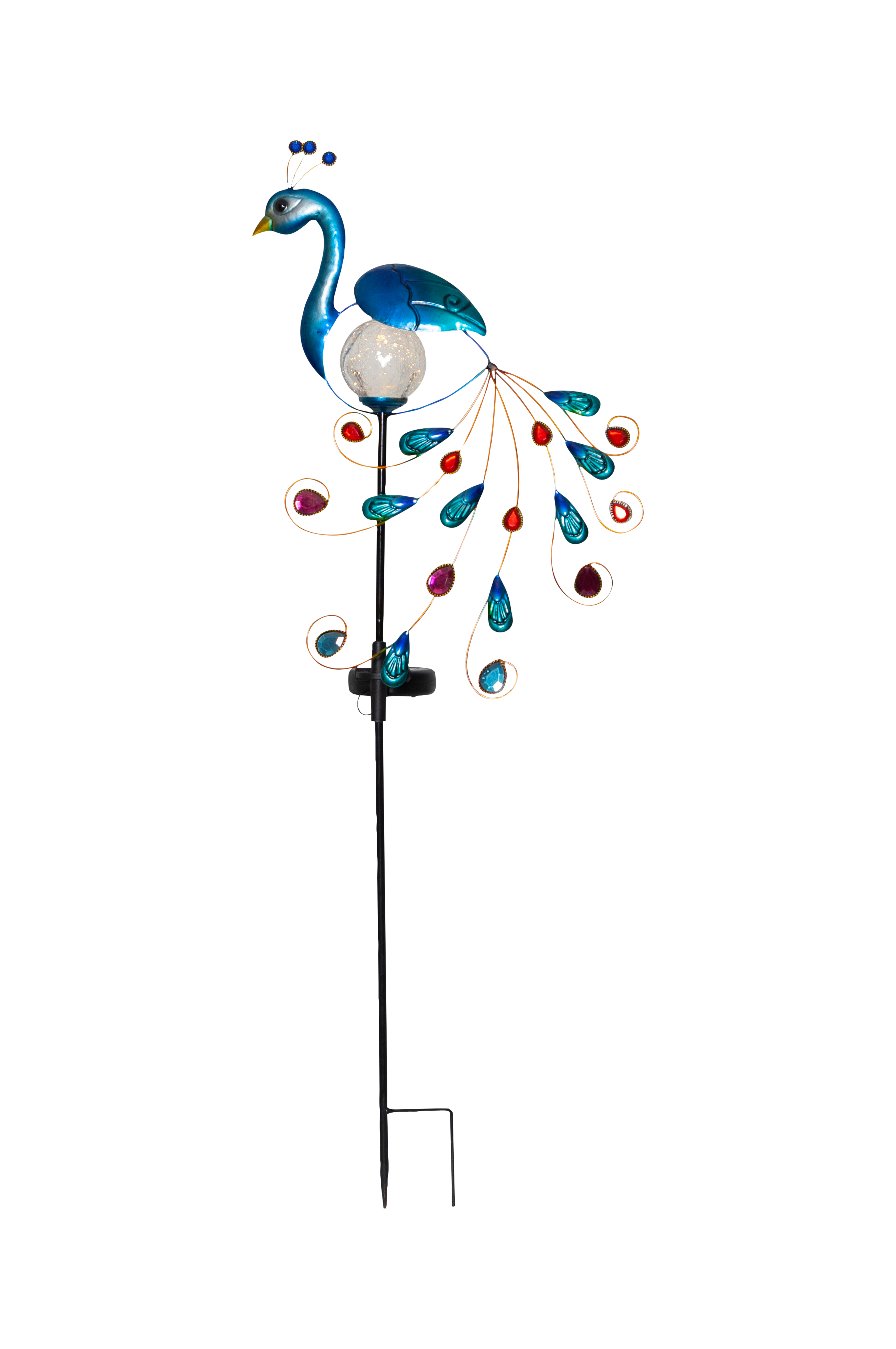 Tyylikäs riikinkukon muotoinen aurinkokennokoriste. Kauniit yksityiskohdat maalattua metallia ja värillisiä kristalleja. Lasipallo valaisee yöllä antaen lämpimän valkoisen valon.