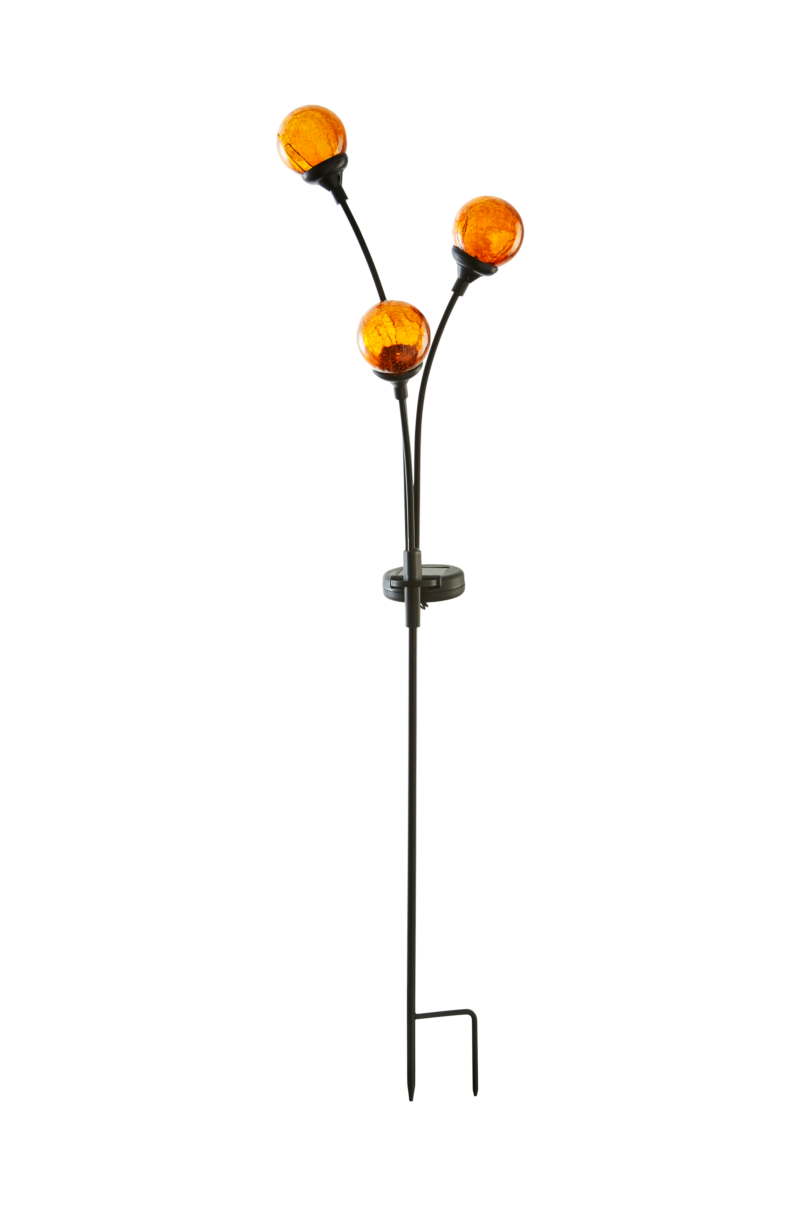 Aurinkokennokoriste maapiikillä. Kaunis koriste, jossa 3 meripihkanväristä lasipalloa. Jokaisessa pallossa on 1 LED-valonlähde, ja ne antavat kauniin valon. Korista puutarhaa maapiikkivalaisimella.