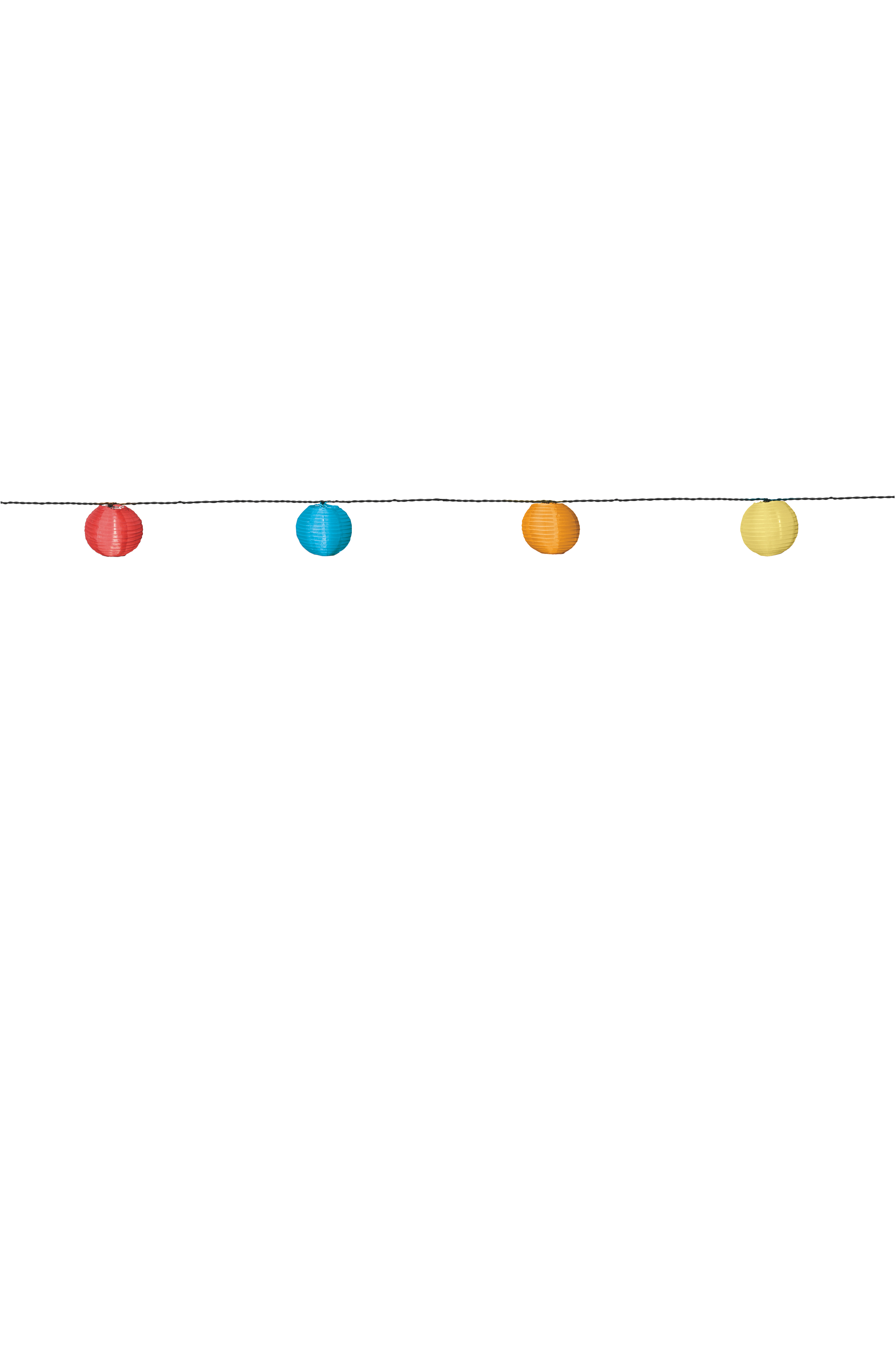 Pituus 470 cm. Syvyys 7,5. Korkeus 7,5 cm. Muovinen johto, jossa valkoiset kangaspallot. 10 kangaspalloa, joita ei voi vaihtaa. LED-polttimot mukana. 2 metriä ennen ensimmäistä valoa. Akku mukana.