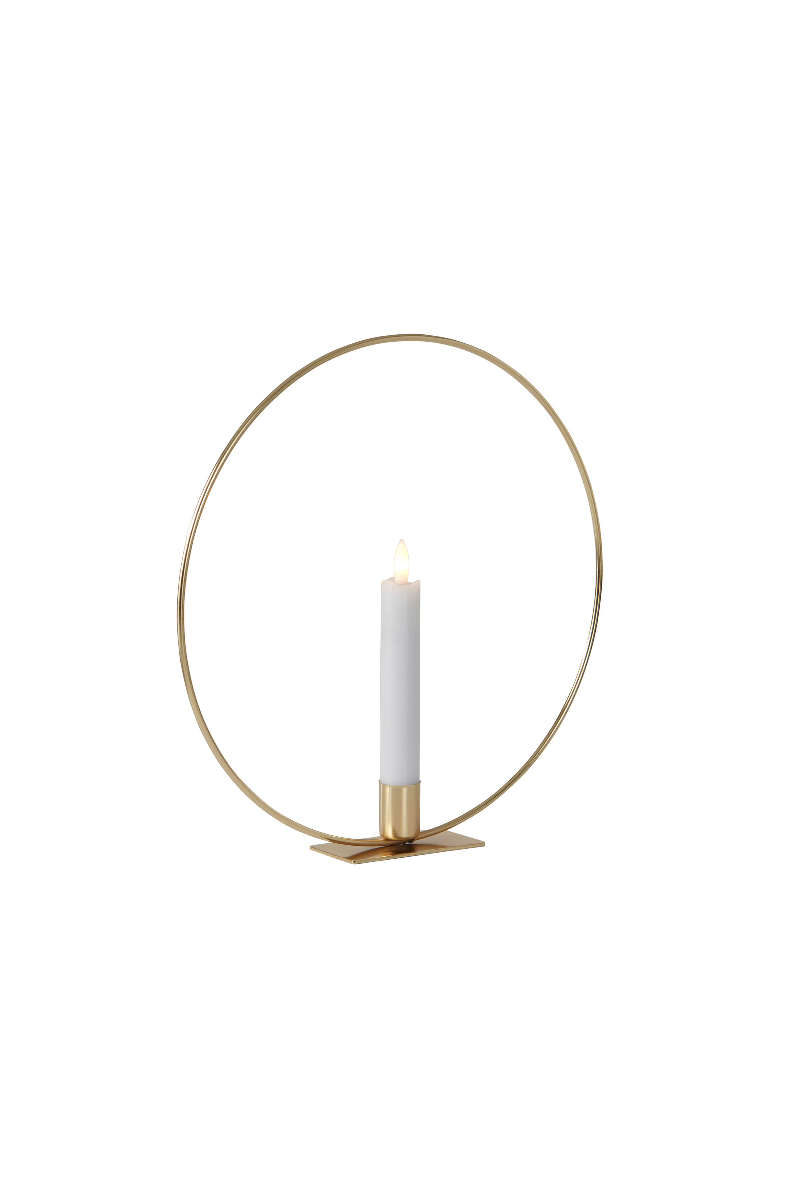 Messinginvärinen renkaanmuotoinen metallipöytäkoriste, jossa LED-antiikkikynttilä. CANDLE RING -koristeessa on sisäänrakennettu toistuva ajastin, joka on päällä 6 tuntia ja pois päältä 18 tuntia. Toimii yhdellä AA-paristolla. Tilaa paristot erikseen.