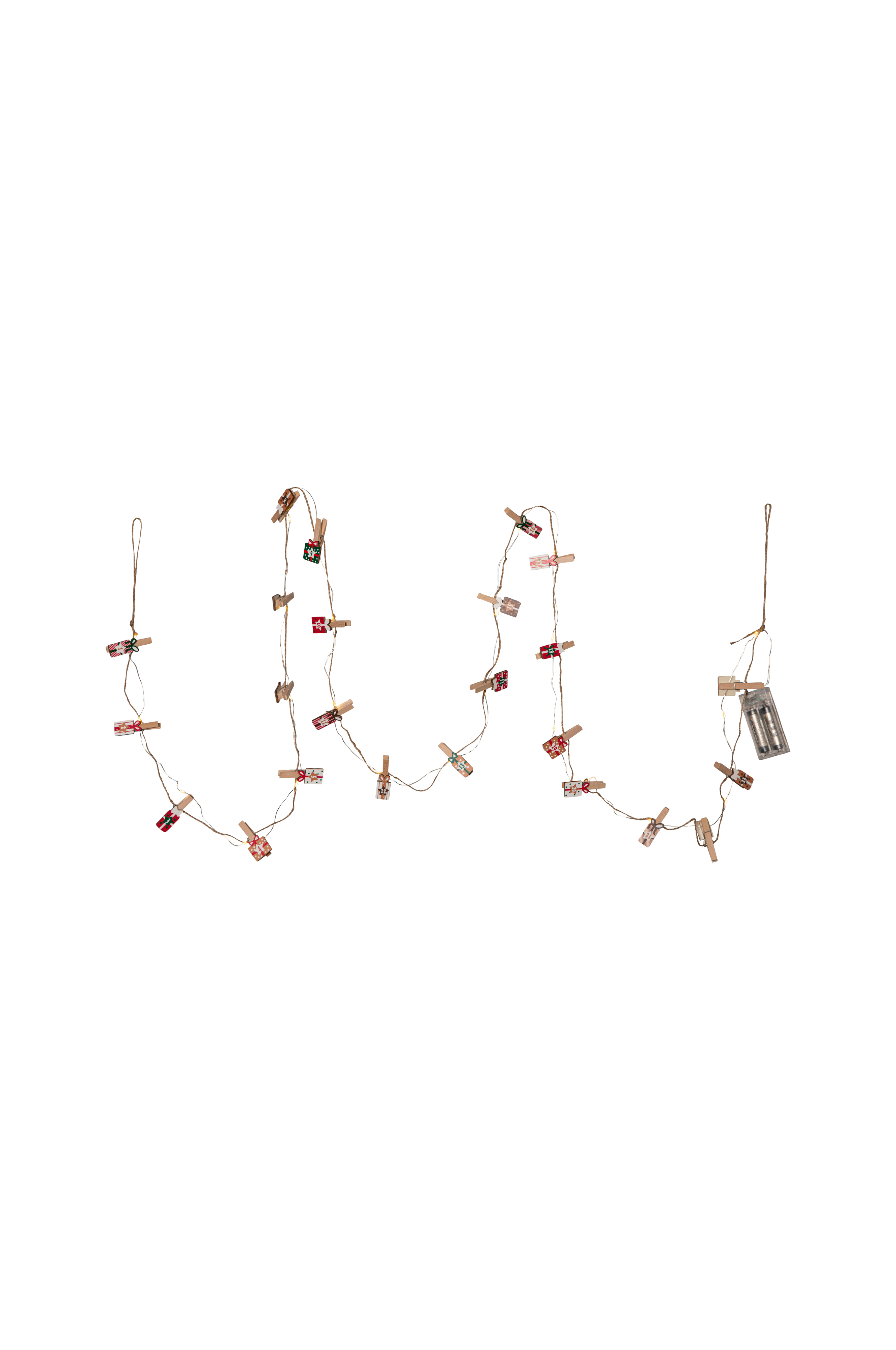 Koristeellinen valoketju ohuesta hopeanvärisestä metallilangasta, jossa on 24 puuklipsiä, jotka on maalattu joulun väreillä ja merkitty numeroilla 1 - 24. Täydellinen jouluaaton lähtölaskentaan. 24 lämpimän valkoista lediä, jotka antavat miellyttävän hehkun. Valoketju saa virtansa 2 aa-paristosta, ajastintoiminto paristokotelossa, sisäkäyttöön.