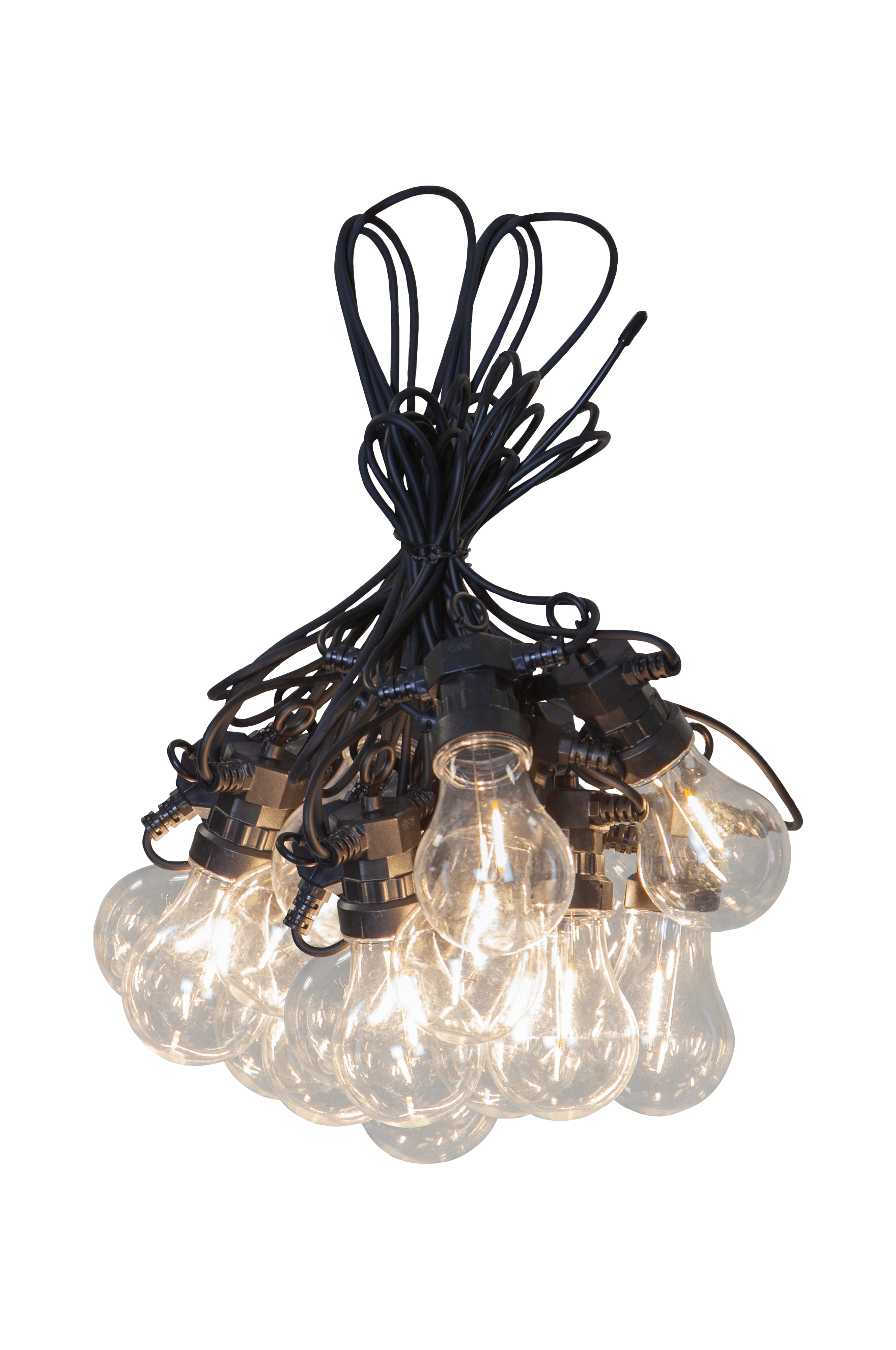 Juhlavaloköynnös. 20 kirkasta lampunkupua, joiden sisällä filamentti-LED. Ihastuttava valoköynnös sopii sekä arkeen että juhlaan. Valaisee kauniisti pimeässä. Valoköynnöksen pituus 855 cm. Lamppujen korkeus 15 cm ja halkaisija 6 cm. Lamppujen välinen etäisyys 45 cm. Liitäntäjohdon pituus 5 metriä. Mukana muuntaja 24 V D 3.6 W IP44.