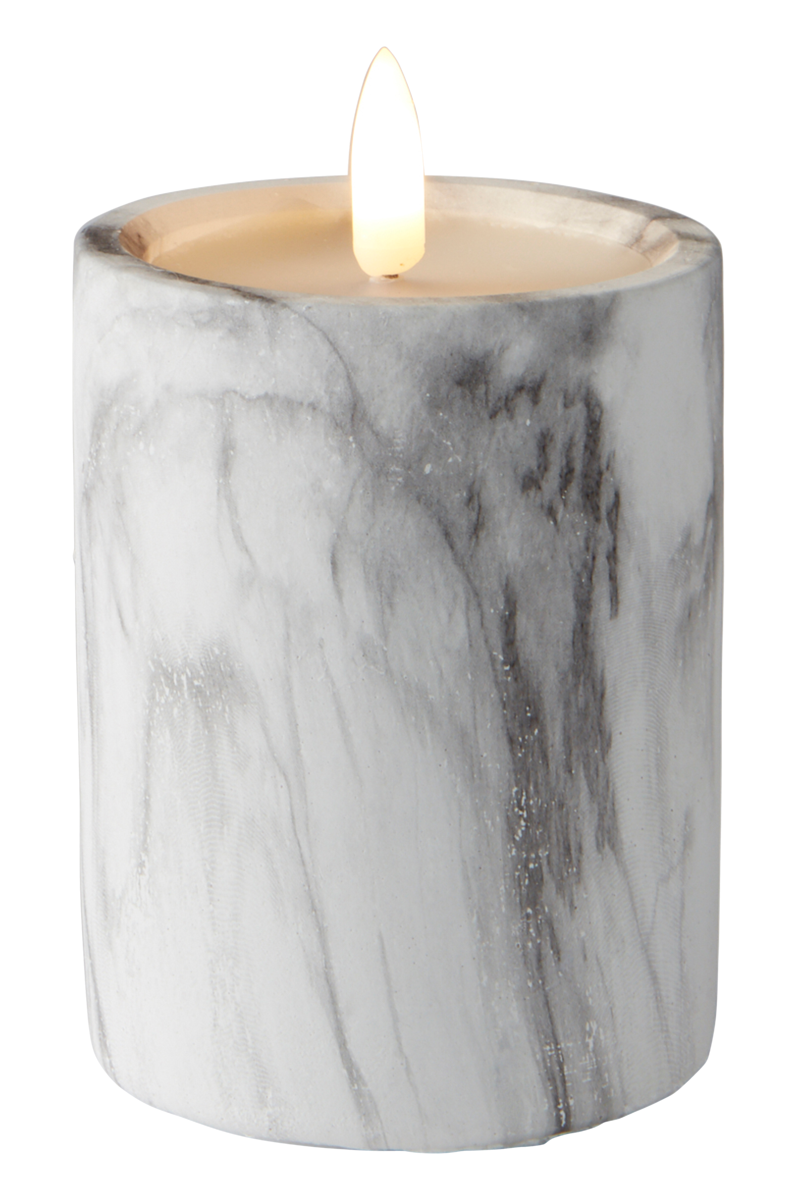 Betoninen kynttilä, jossa aidonnäköinen marmorikuvio. Paristokäyttöinen LED-kynttilä on täysin paloturvallinen. Luonnollisessa liekissä on lämpimän valkoinen valo. Ajastintoiminnon avulla se on helppo ajastaa valaisemaan haluttuun aikaan. 6 tuntia päällä ja 18 tuntia pois päältä. Paristolokero ja liekki muovia. Sisäkäyttöön.