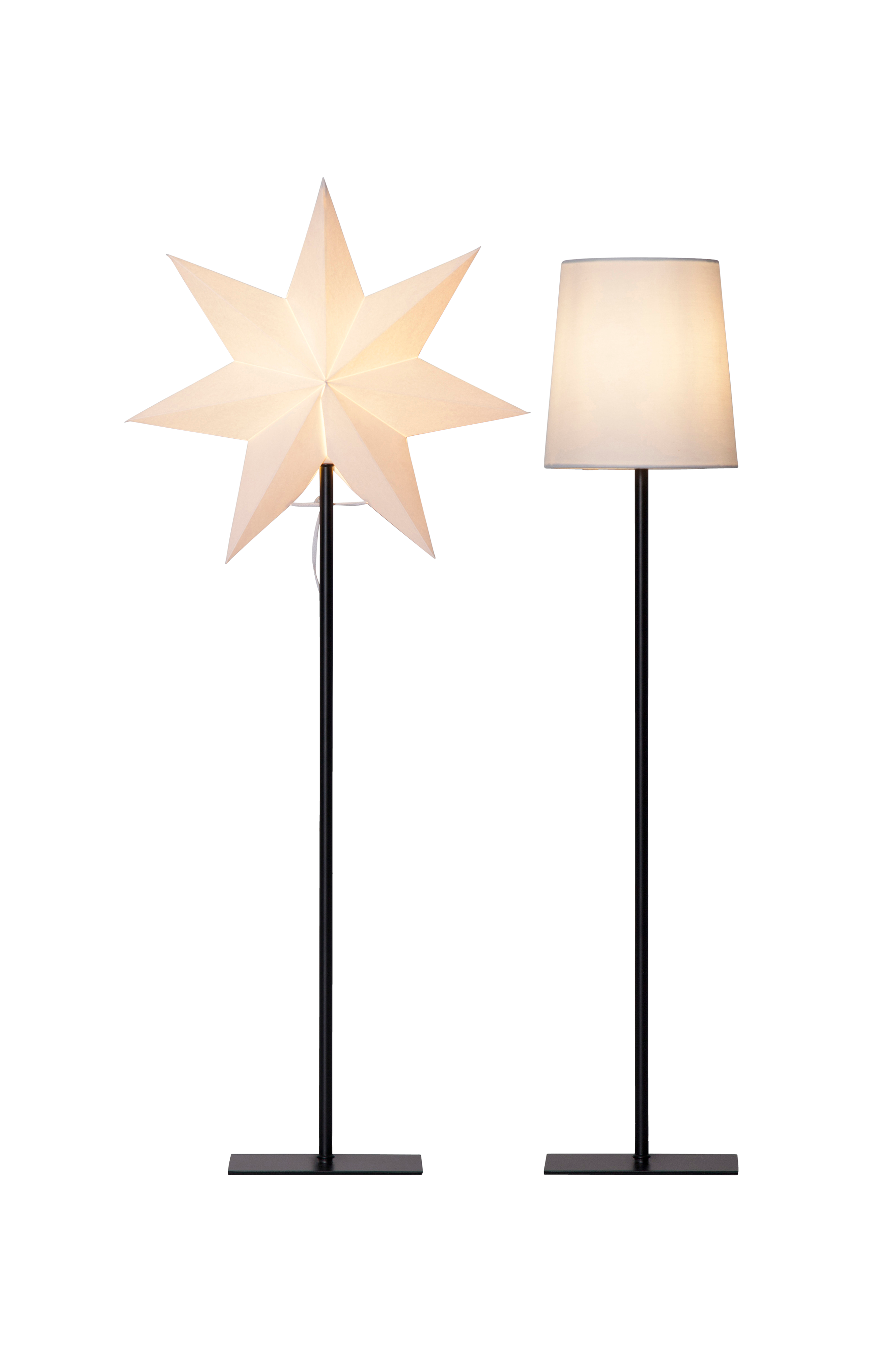 Pöytävalaisin, jossa tähti ja lampunvarjostin. Voit käyttää valaisinta läpi vuoden. Suora jalka metallia. Tähti pahvia, metallirunko. Kangasvarjostin, metallirunko. Musta kangasjohto 1,8 m. Lamppu ei mukana.