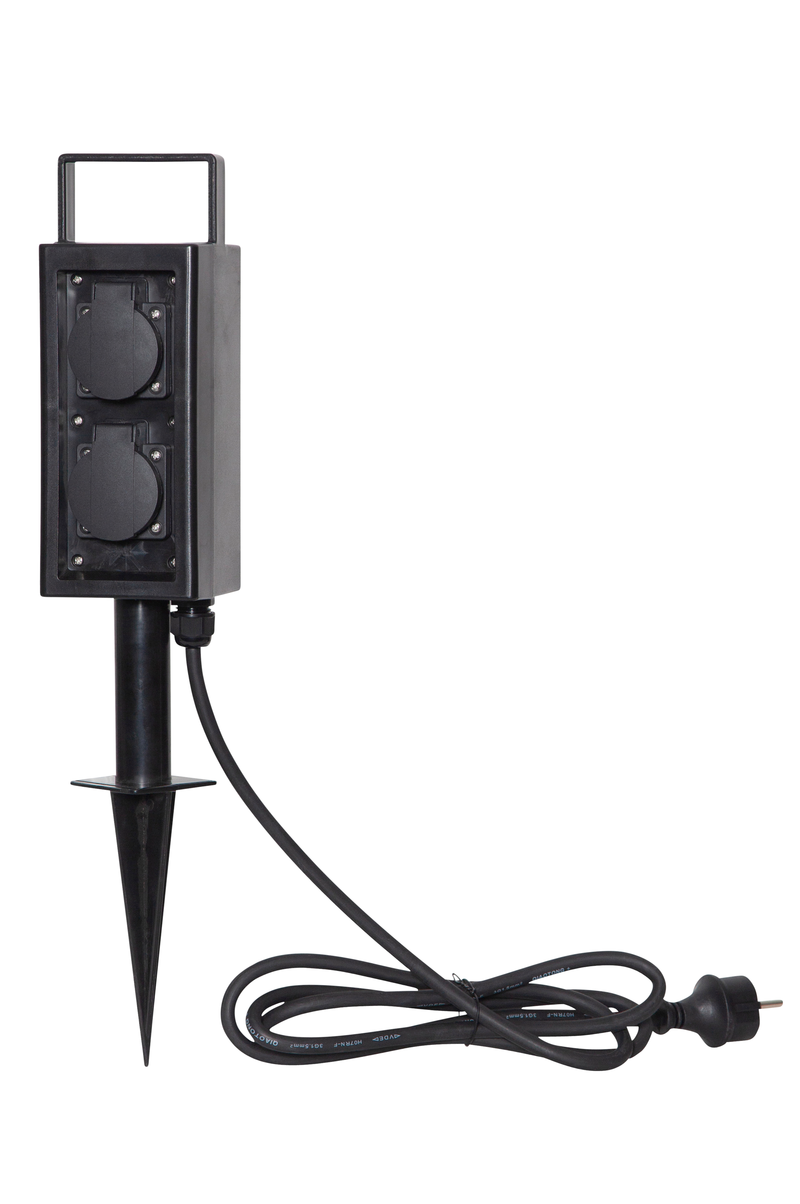 Kätevä haaroitusrasia, johon kytketään johdot. Maapiikki. Sopii täydellisesti ulkotilaan tai puutarhaan, mikäli haluat kytkeä monta valaisinta samaan pistorasiaan. Ulkokäyttöön. 4 kpl pistokkeita. Mustan johdon pituus 2 m. 220-240 V. Kokonaisliitäntäkapasiteetti enintään 3680 W.