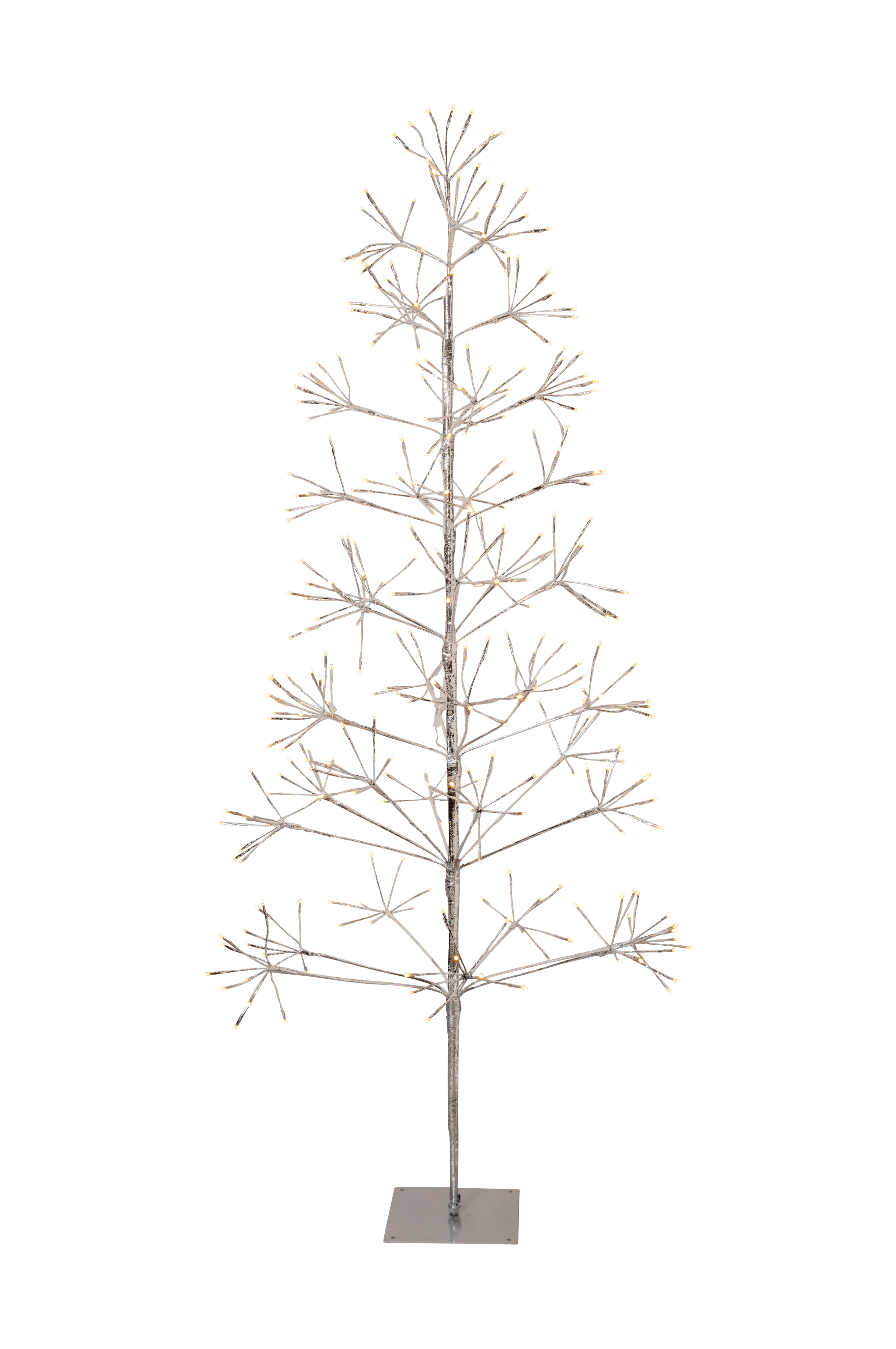 Hopeanvärinen koristepuu ulkokäyttöön. Täydellinen tunnelman luoja puutarhassa tai ulkotilassa. Puun korkeus on 180 cm. 320 LED-valonlähdettä, jotka antavat ihanan lämpimän valkoisen valon. Toimii muuntajalla.