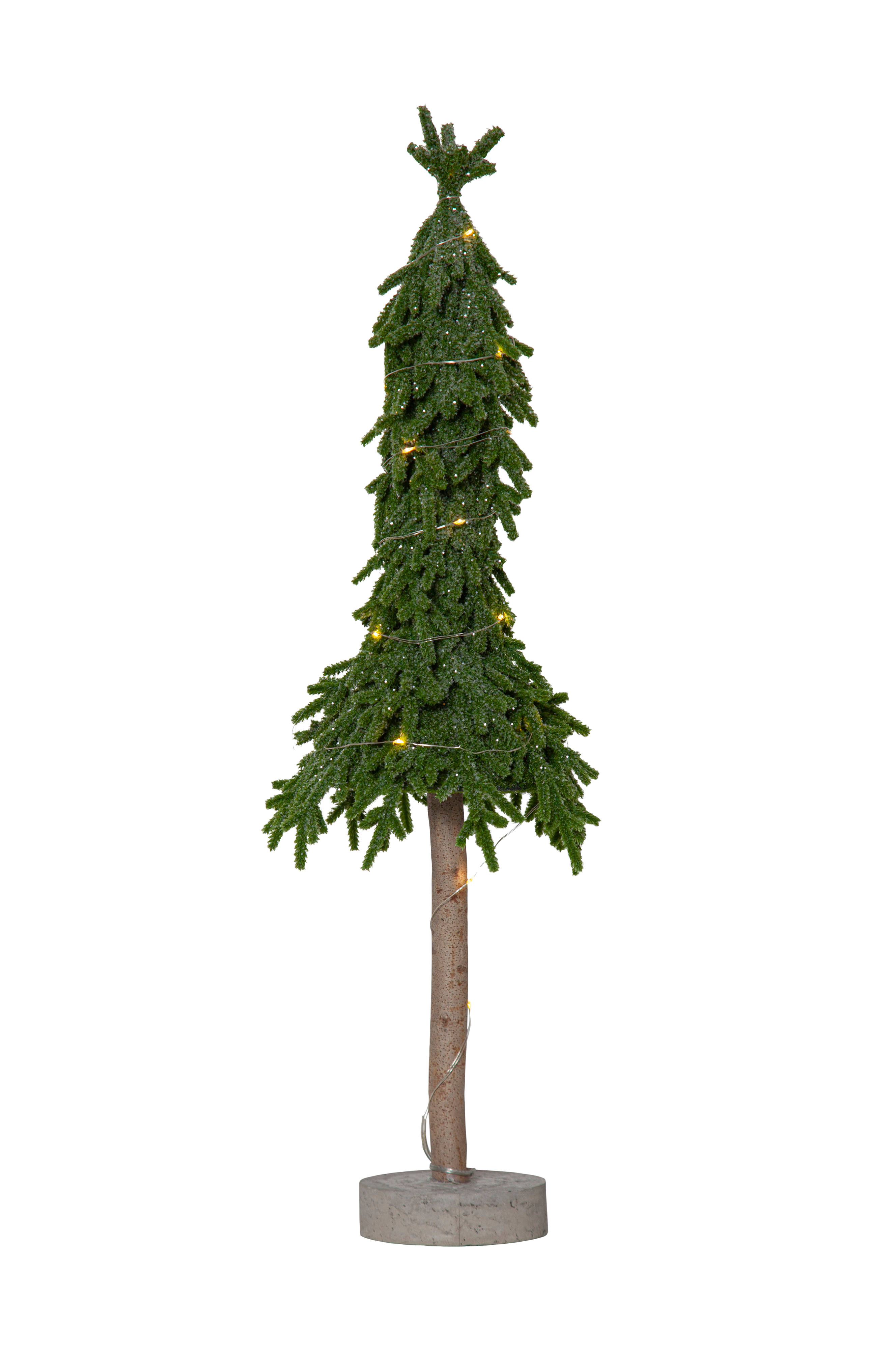 Pöytäkuusi PE-materiaalia. Hieman kimalletta ja jalka sementtiä. 20 pientä lämpimän valkoista dew drops -lamppua. Paristokäyttöinen. Toimii kahdella AA-paristolla. Paristot eivät sisälly toimitukseen. Paloaika n. 200 tuntia.