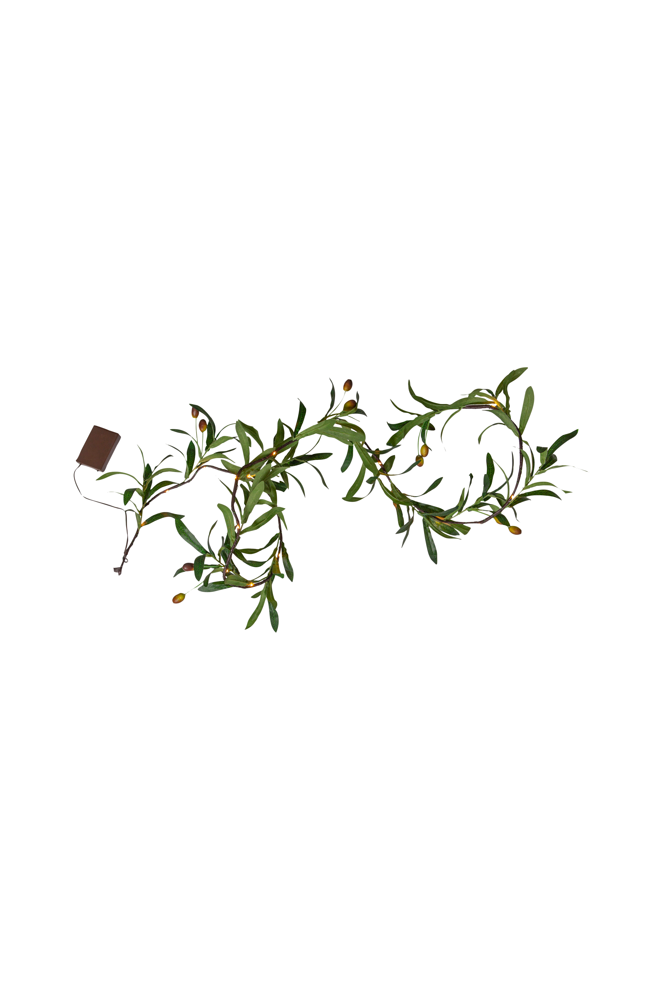 Koristeellinen ja muotoiltava köynnös, jossa oliivinlehtiä ja oliiveja. Pituus 180 cm. Antaa miellyttävän valon ja sopii koristeeksi sisälle ja ulos. Paristorasia, jossa ajastintoiminto. Ulkokäyttöön.