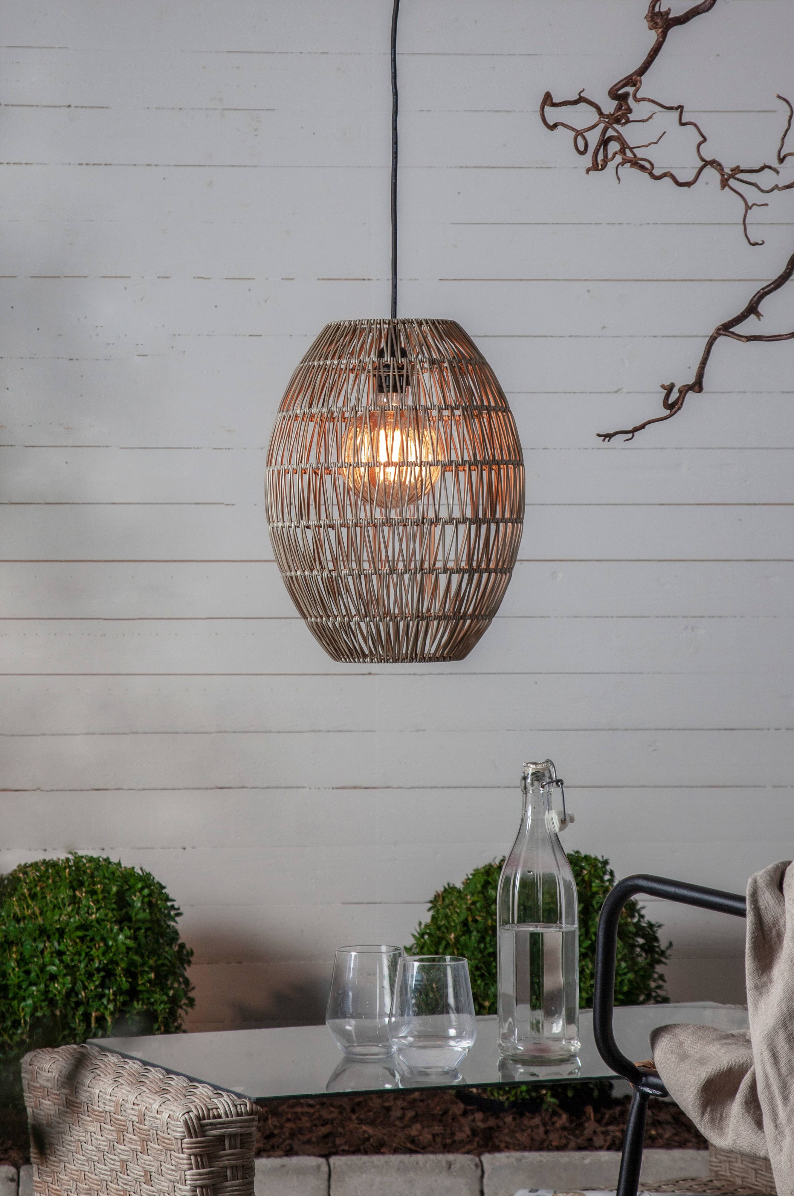 Korkea lampunvarjostin polyrottinkia. Ulkokäyttöön. Korkeus 40 cm ja halkaisija 30 cm. Mukana 5 metrin musta ripustussarja, jossa E27-lampunkanta. IP44. Valonlähde ei sisälly toimitukseen.