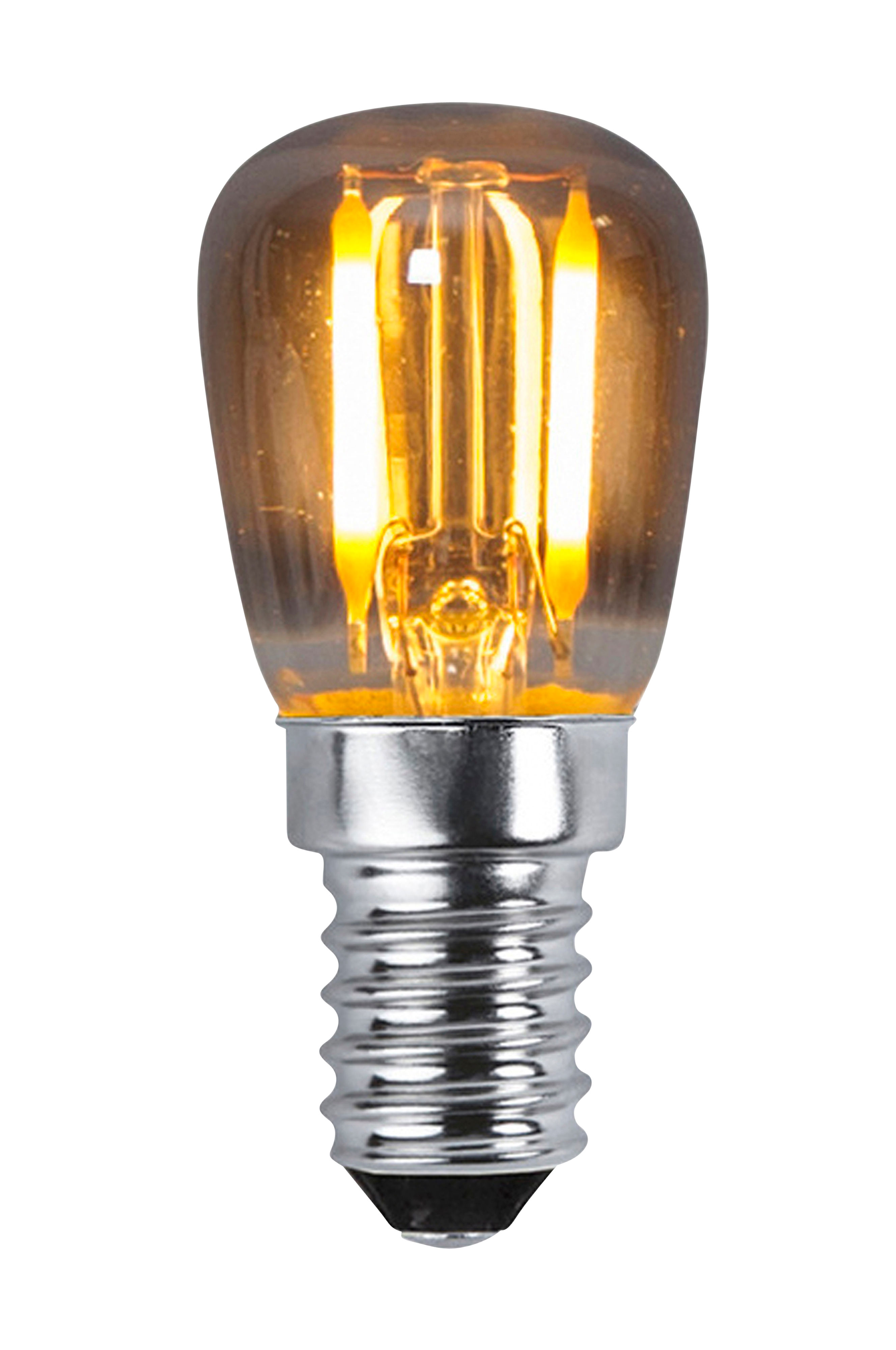 LED-lamppu savunväristä lasia. Alhainen lumen-arvo ja lämmin värilämpötila. E14-lampunkanta. Korkeus 5,80 cm, halkaisija 2,60 cm. Teho 1 W.