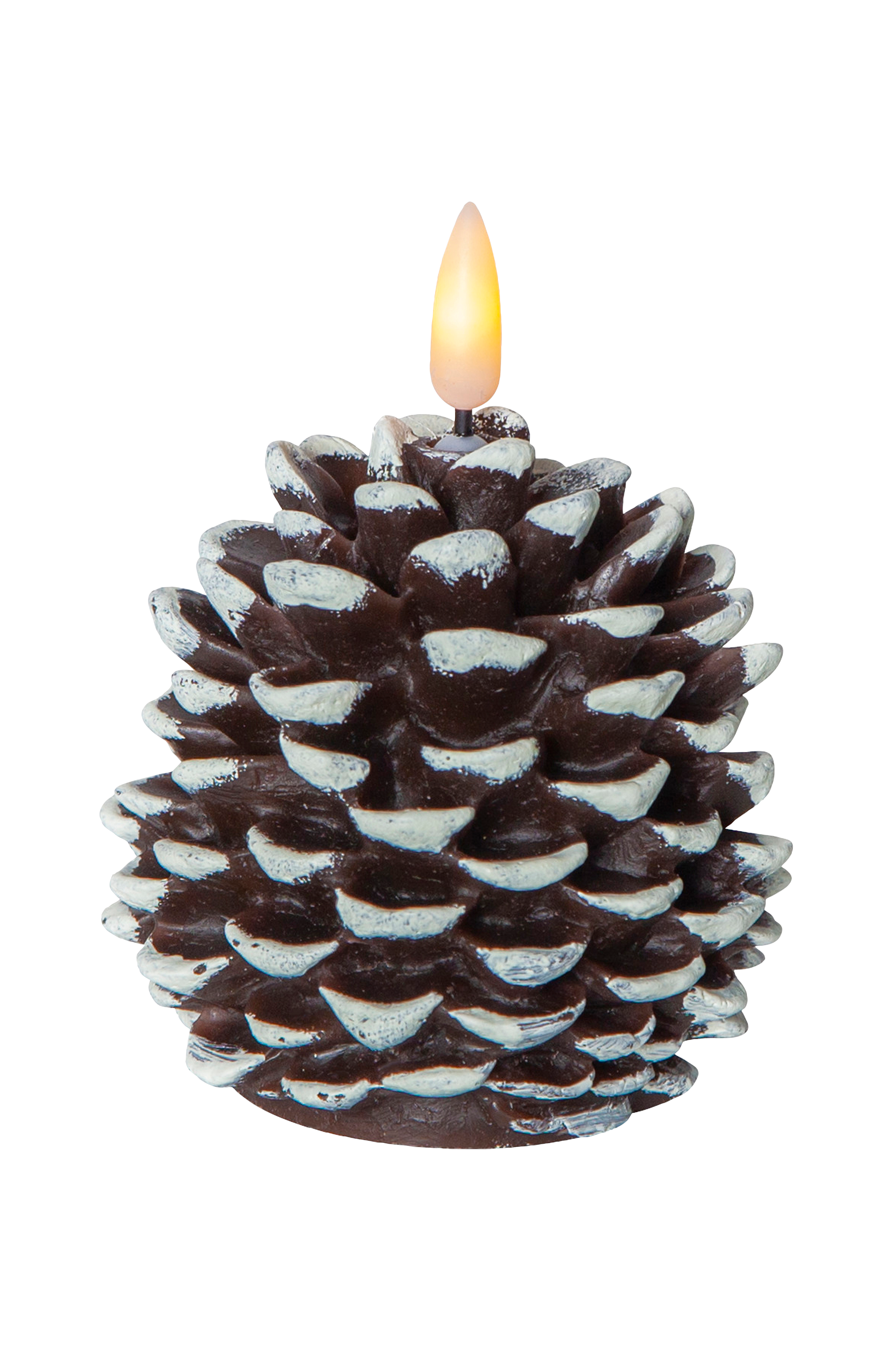 Ruskea koristekäpy, jossa erittäin luonnollisen näköinen liekki. 1/pakkaus. Lämpimän valkoinen valo. Kynttilässä on sisäänrakennettu ajastin, jonka avulla se on helppo ajastaa valaisemaan haluttuun aikaan. Korkeus 10,5 cm ja halkaisija 8 cm. Ajastin, 6 h päällä. Toimii yhdellä CR2032-paristolla (mukana).