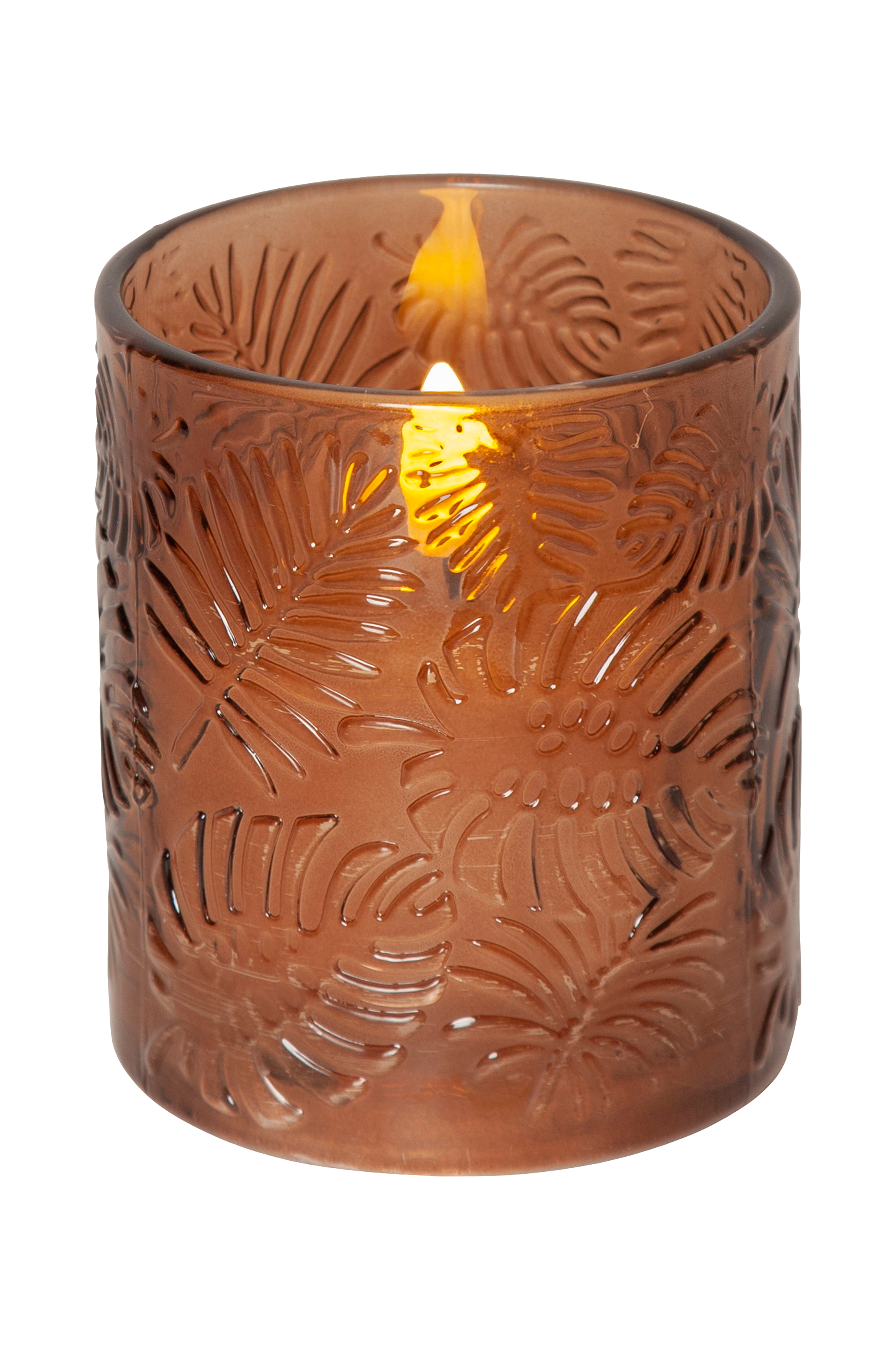 Flamme Leaf on valmistettu ruskeasta lasista, jossa on lehtikuvioinen reliefi. Sisäpuolella valkoinen vahakynttilä. Kynttilän koko on noin 8,5 x 10 cm. Paristokäyttöinen kynttilä on kaunis koriste yksinään sekä ryhmässä muiden Flamme-sarjan kynttilöiden kanssa. Siinä on ajastintoiminto ja kun kytkin on ajastintilassa, loistaa kynttilä noin 30 päivää kauniilla ja todentuntuisella lämpimän valkoisella liekillä. Toimii 2 x AA-paristolla, eivät sisälly toimitukseen.