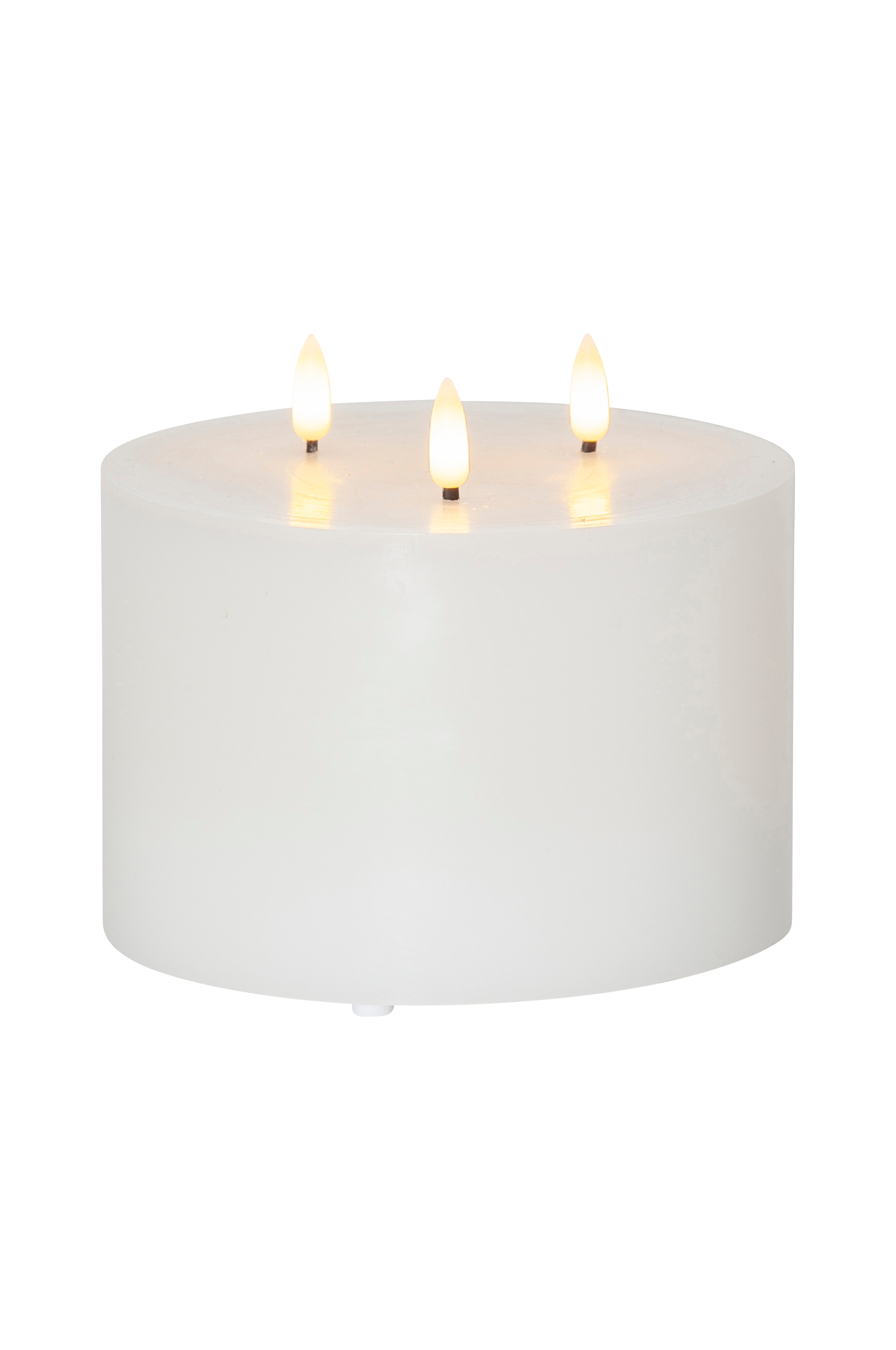 Flamme-tuoteperheemme vahakynttilä, jossa 3 aidonnäköistä liekkiä, joissa lämpimänvalkoinen valo. Sisäkäyttöön. Kynttilässä on sisäänrakennettu ajastintoiminto, 6 tuntia päällä ja 18 tuntia pois päältä. Ledlamppu mukana. Paristot eivät sisälly pakkaukseen. Korkeus liekin kanssa 13 cm ja halkaisija 15 cm. Kokonaisteho 0,18 W. Voltit 3 V DC.