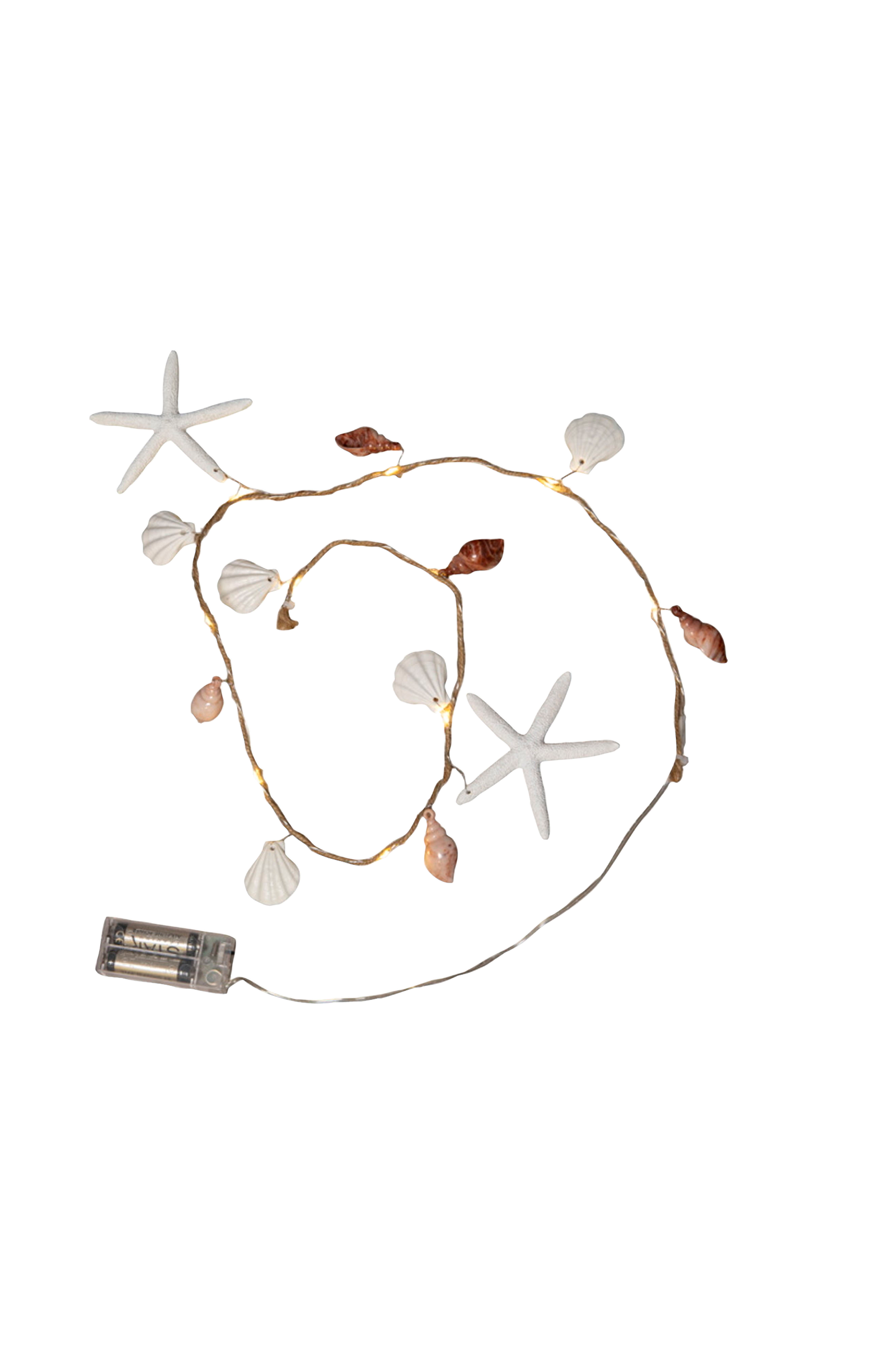 Paristokäyttöinen valoketju sisäkäyttöön, jossa on merestä inspiroituneita muovisia koristeita, kuten shells ja meritähtiä. 10 lämpimänvalkoista lediä antavat ihanan hehkun. Ohuen metallikaapelin ympärille kiedottu juuttiköysi. Valoketjussa on ajastintoiminto.