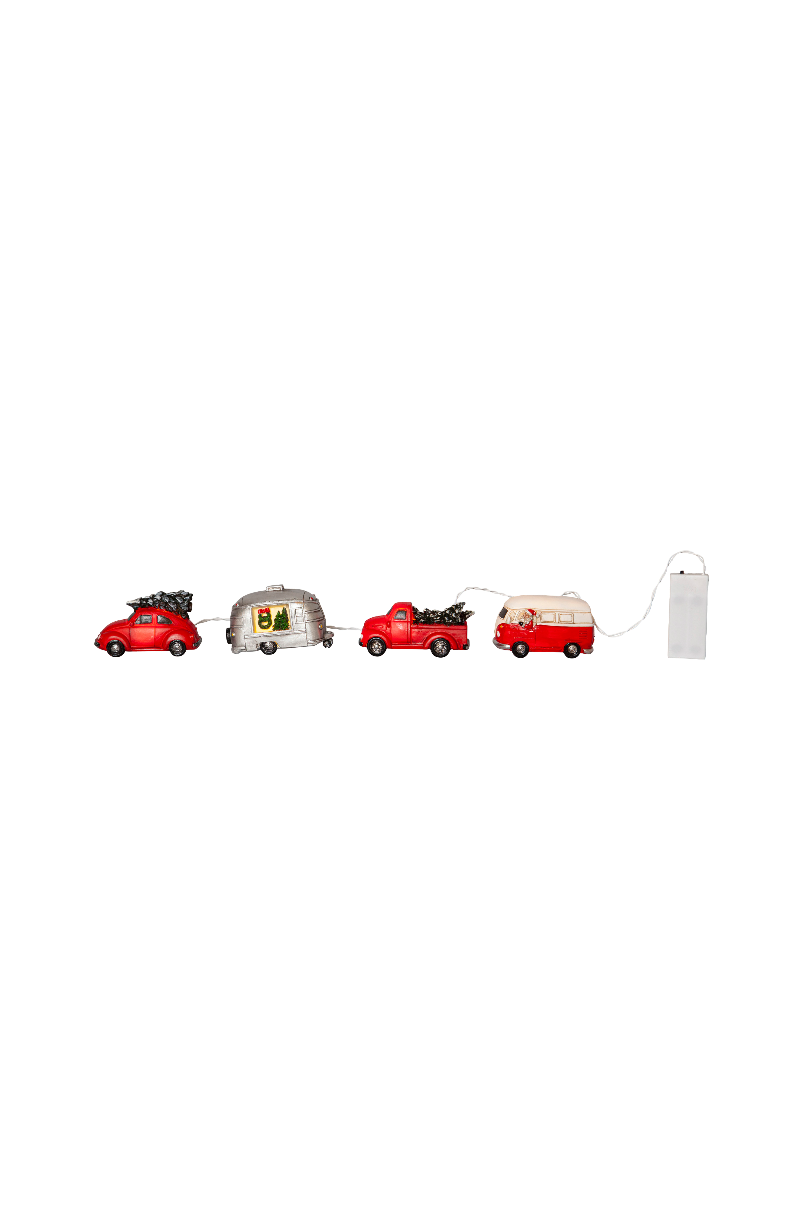 Kahdeksan osainen koristesetti on täydellinen joulukoriste. Setissä on kolme ajoneuvoa, asuntovaunu, lyhtypylväs, kuusia, lumiukko ja valoköynnös. Se loistaa kauniisti autoissa ja asuntovaunussa, kun tuote on päällä. Tuote toimii paristoilla. Aseta pöydälle tai hyllylle luomaan miellyttävää joulutunnelmaa.