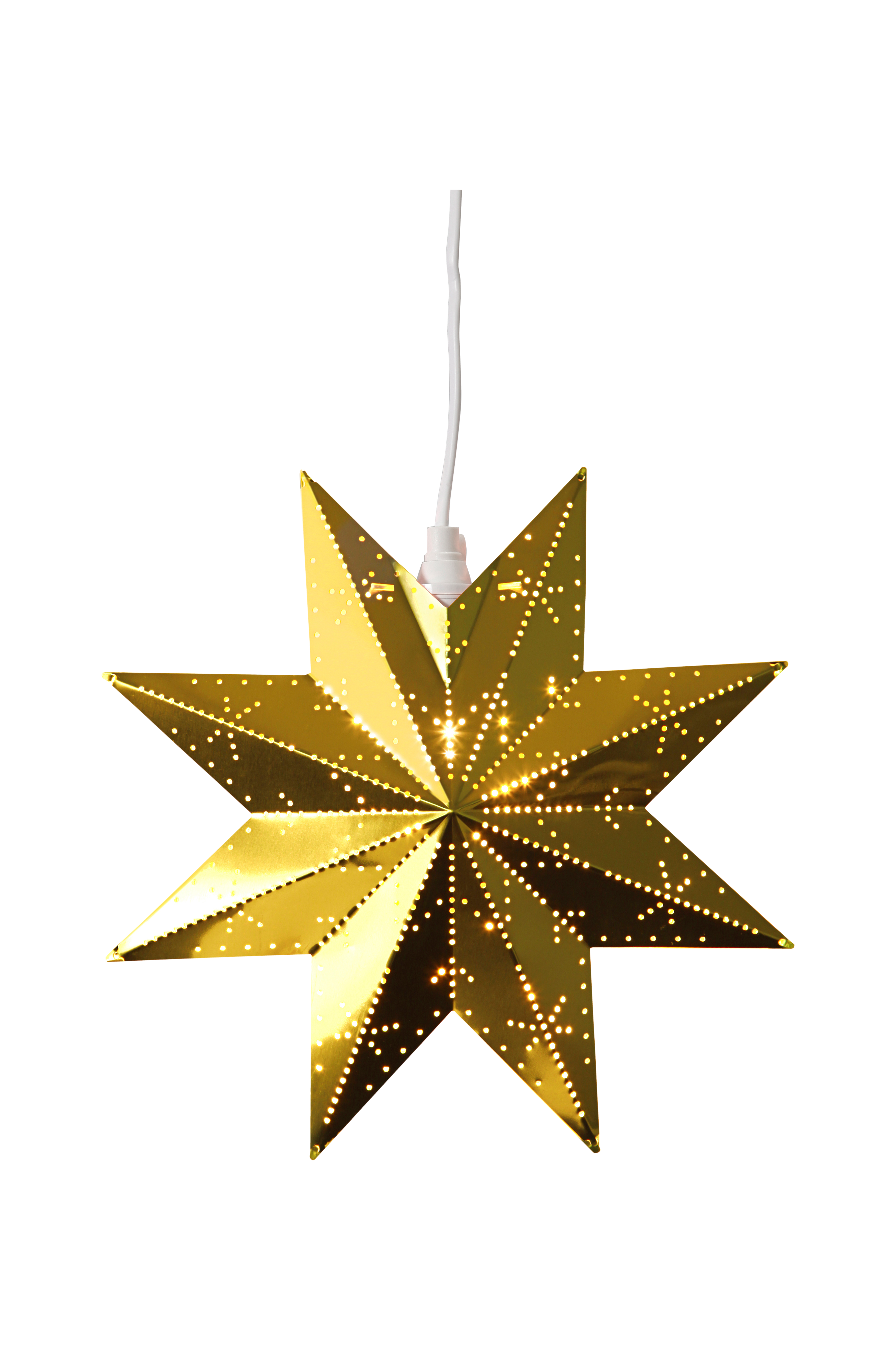 Mitat: Leveys 28 cm. Syvyys 8 cm. Korkeus 28 cm. Messinginvärinen metallivalotähti. Toimitukseen sisältyy 3,5 m:n ripustussarja. 230 V E14-lampunkanta. Valonlähde ei sisälly toimitukseen.