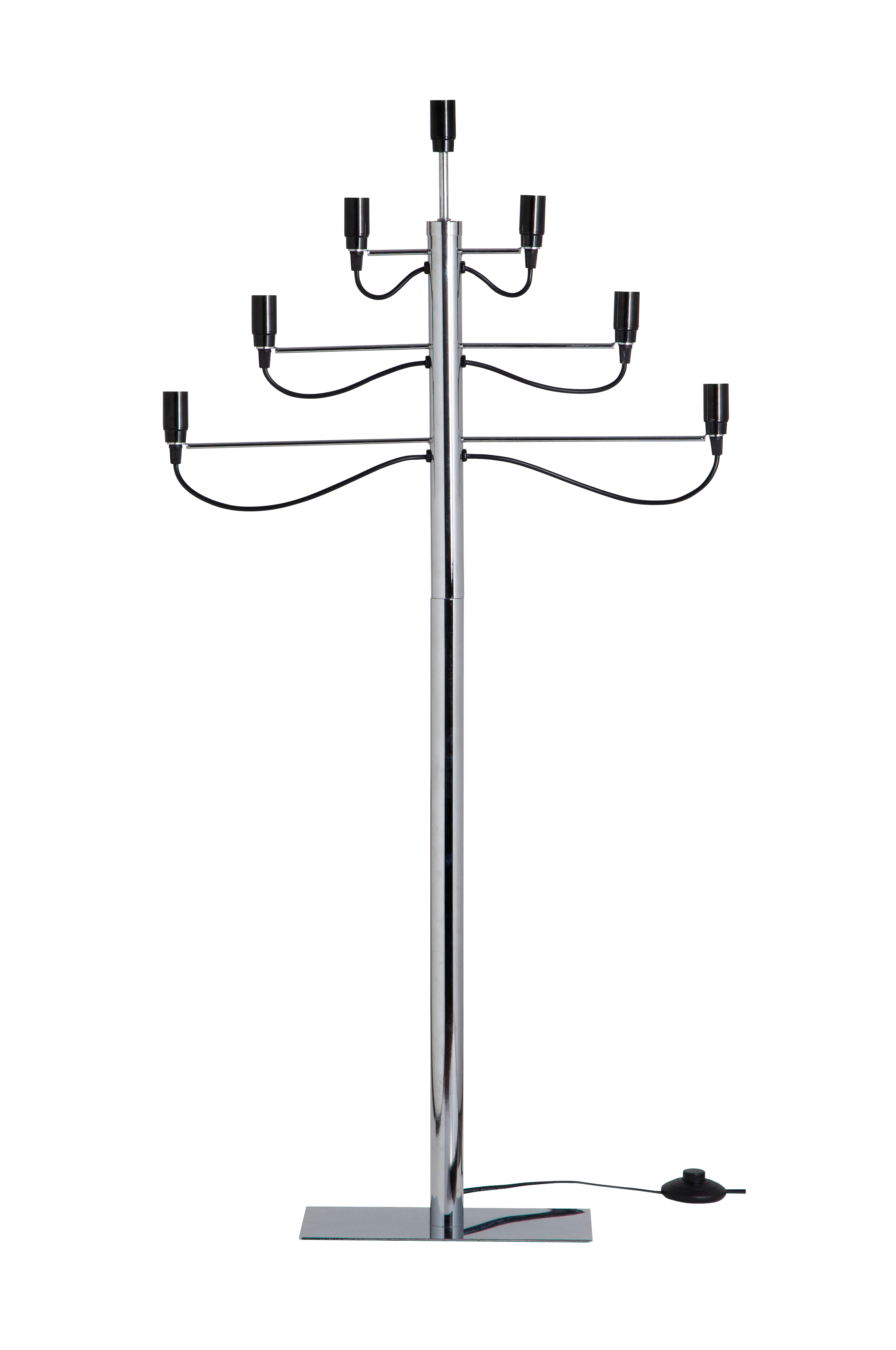 Tyylikäs ja moderni lattiakynttelikkö krominväristä metallia. Paikka 7 valonlähteelle. Sijoita kynttelikkö lattialle luodaksesi modernin ilmeen kotiisi. Valonlähteet eivät sisälly toimitukseen. Musta johto, johdon pituus 1,8 m.