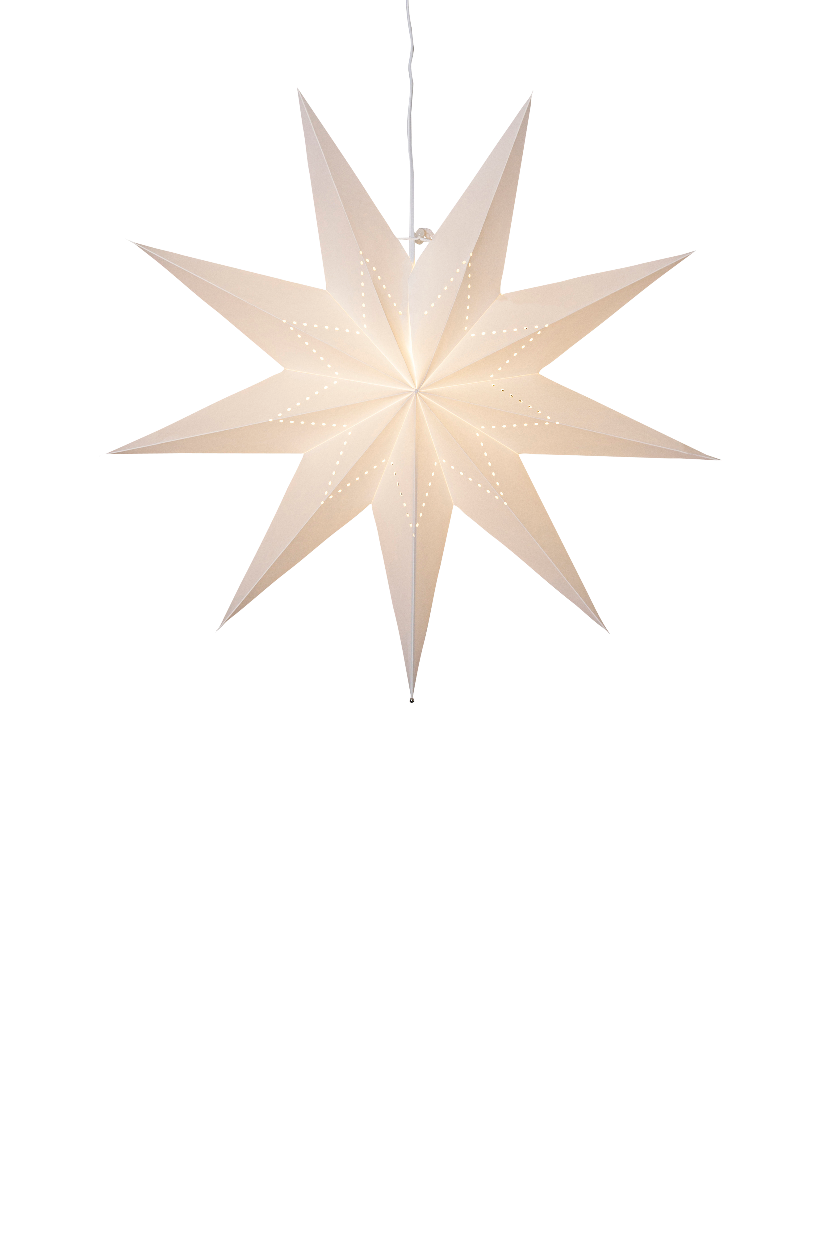 Valkoinen paperitähti, jossa on tähdenmuotoinen reikäkuvio. Ripusta yksi tai useampi tähti yhdessä ikkunaan tai seinää vasten koristamaan joulua ja adventtia varten. Tähti sisältää johtosarjan e14-lamppua varten ja siinä on tilaa yhdelle valonlähteelle.