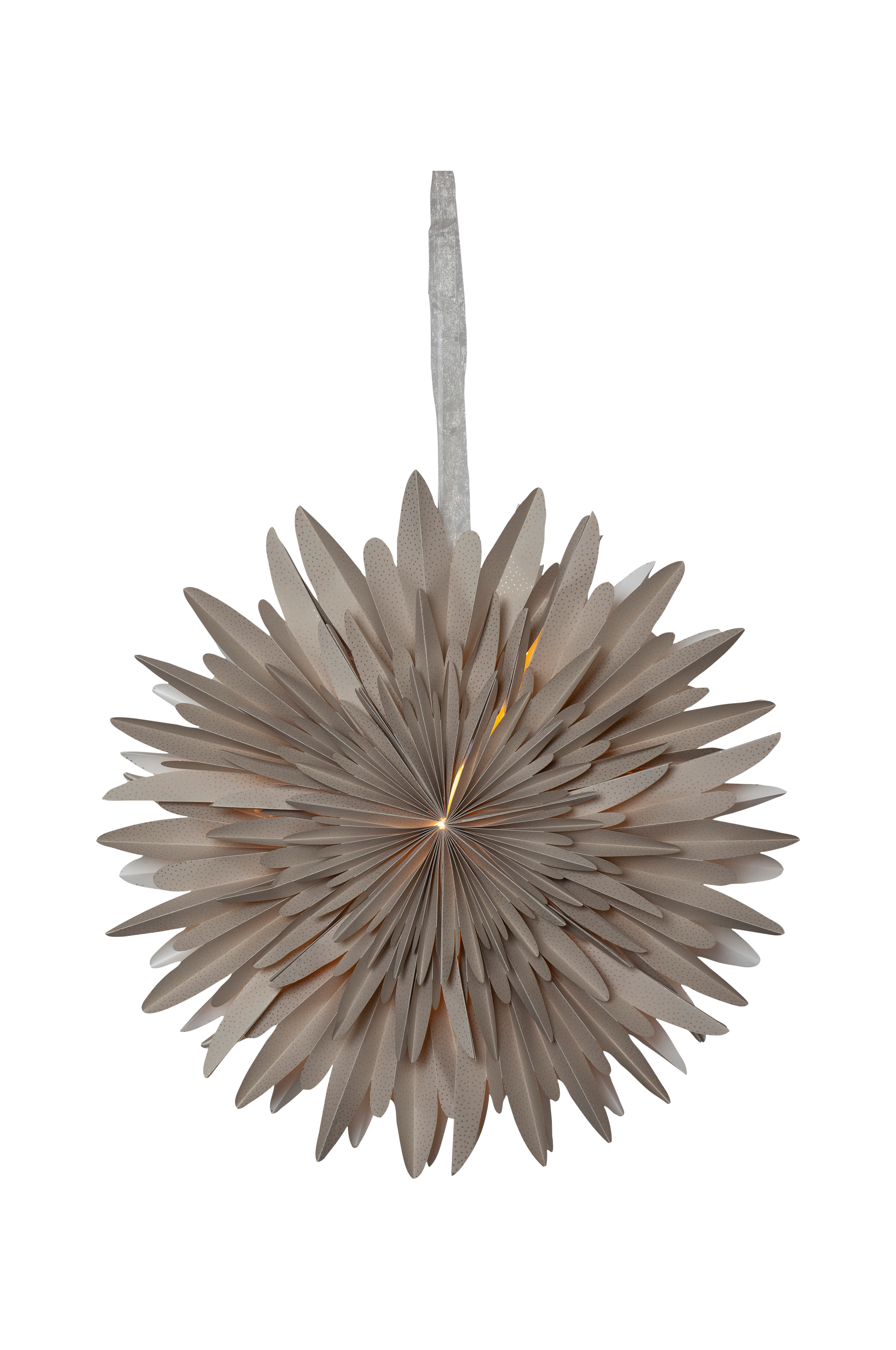 Upea paperitähti on valmistettu kolmikerroksisesta paperista. Paperitähdessä on pyöristetyt sakarat, mikä saa sen näyttämään talviselta. Mukana tyylikäs nauha tähden ripustamiseen. Tähti luo kotiin erityisen joulutunnelman. Voidaan ripustaa sekä ikkunaan että seinälle. Tilaa myös johtosarja ja valonlähde, niin saat valaisevan tähden.