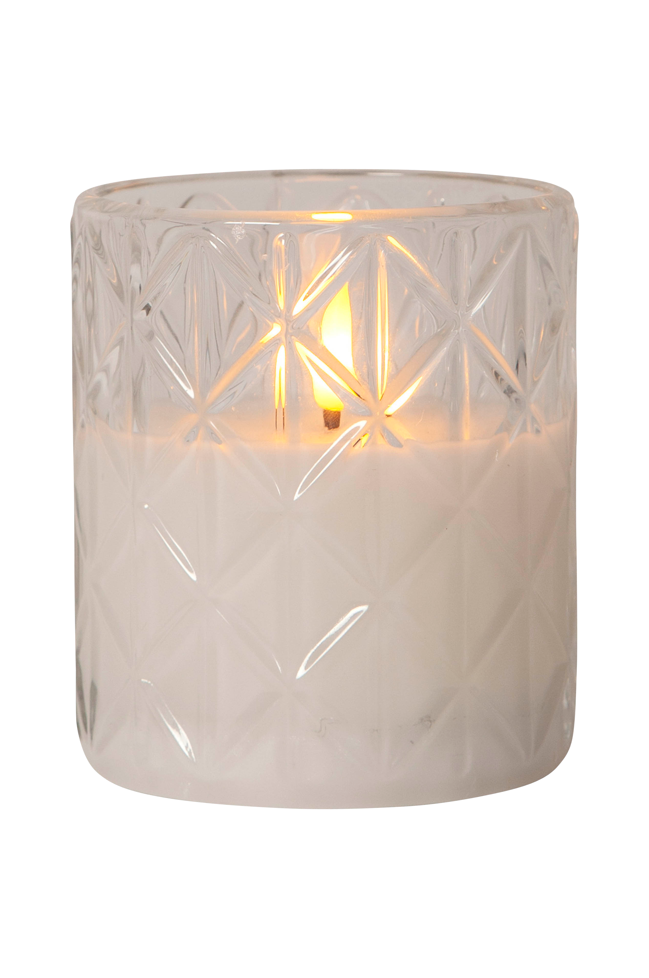 Flamme Romb -vahakynttilän ympärillä olevassa lasikuoressa on vinoneliöinen kuvio. Kynttilän koko on noin 8 x 10 cm. Paristokäyttöinen kynttilä on kaunis koriste yksinään sekä ryhmässä muiden kynttilöiden kanssa. Siinä on ajastintoiminto ja kun kytkin on ajastintilassa, loistaa kynttilä noin 30 päivää kauniilla ja todentuntuisella lämpimän valkoisella liekillä. Toimii 2 x AA-paristolla, eivät sisälly toimitukseen.