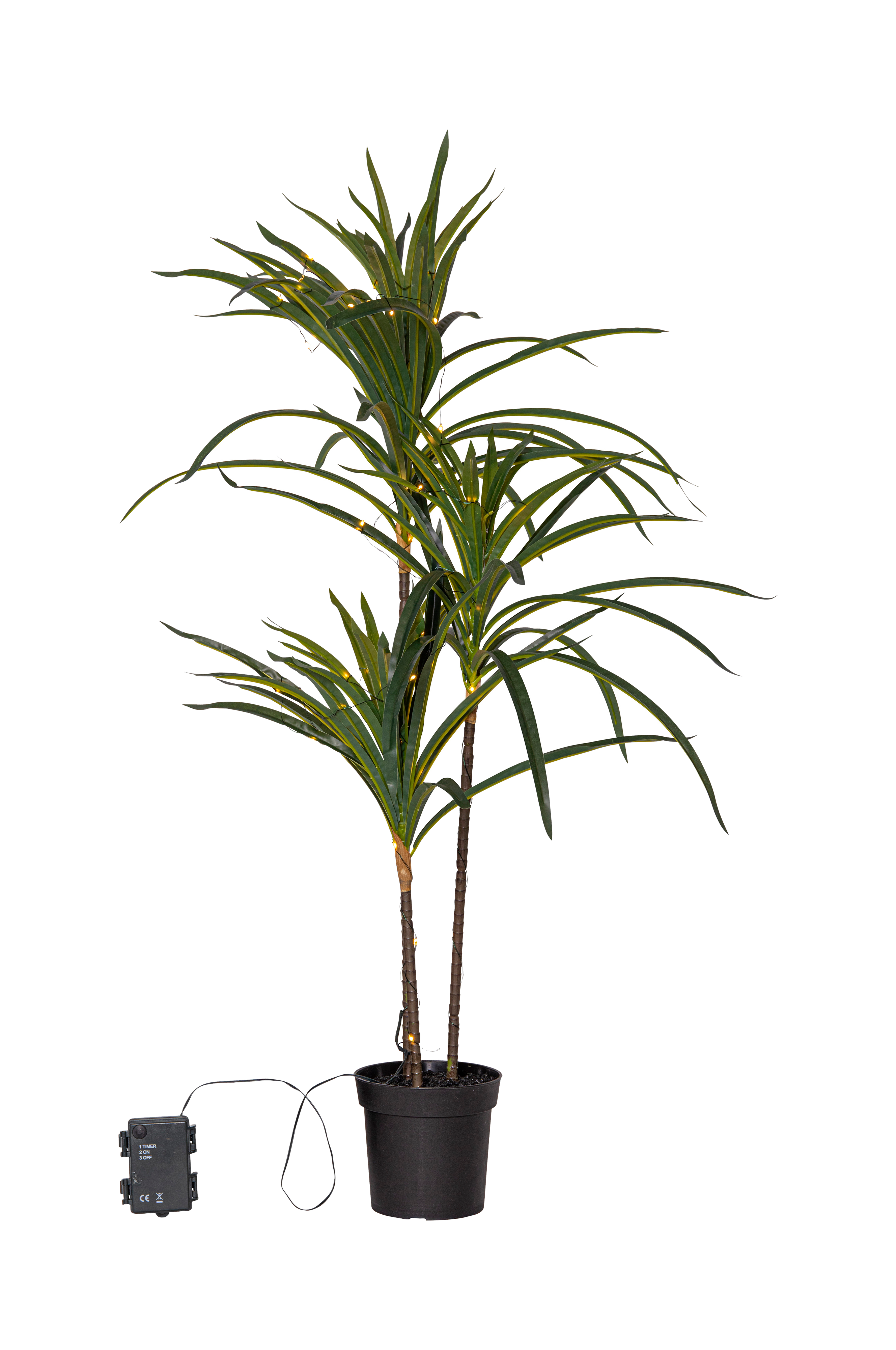 Koristeellinen keinotekoinen palmu, jossa on kastepisara-valoketju, 50 lämpimän valkoista valopistettä antavat mukavan hehkun. Täydellinen viherkasvi kodin hieman pimeämpiin nurkkiin, sopii myös ulkotiloihin, sillä paristokotelo on sovellettu ulkokäyttöön. Musta muoviruukku helppoa sijoittelua varten.