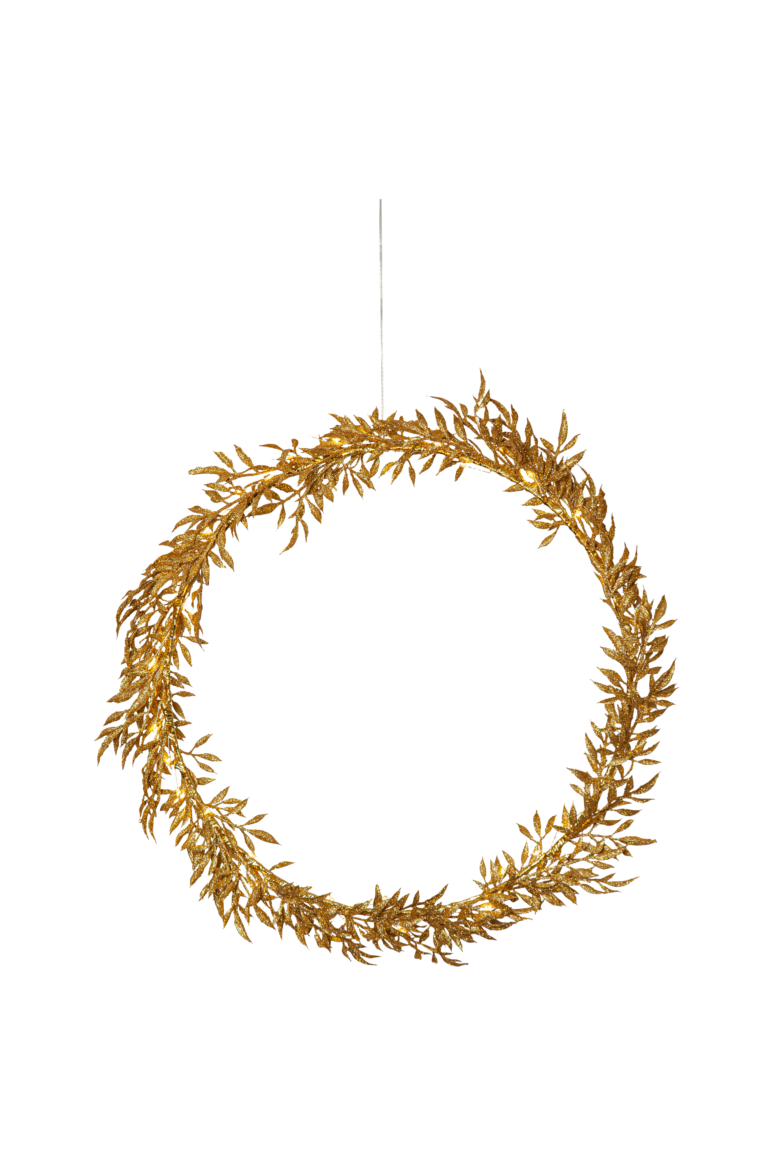 Ylellinen kranssi, jonka voi ripustaa seinälle tai ikkunaan. Kranssissa on kullanhohtoiset lehdet, jotka luovat täyteläisen ja loistokkaan vaikutelman. 50 pientä LED-lamppua loistaa tunnelmallisesti kranssissa. Käytä joulu- tai juhlavalona.