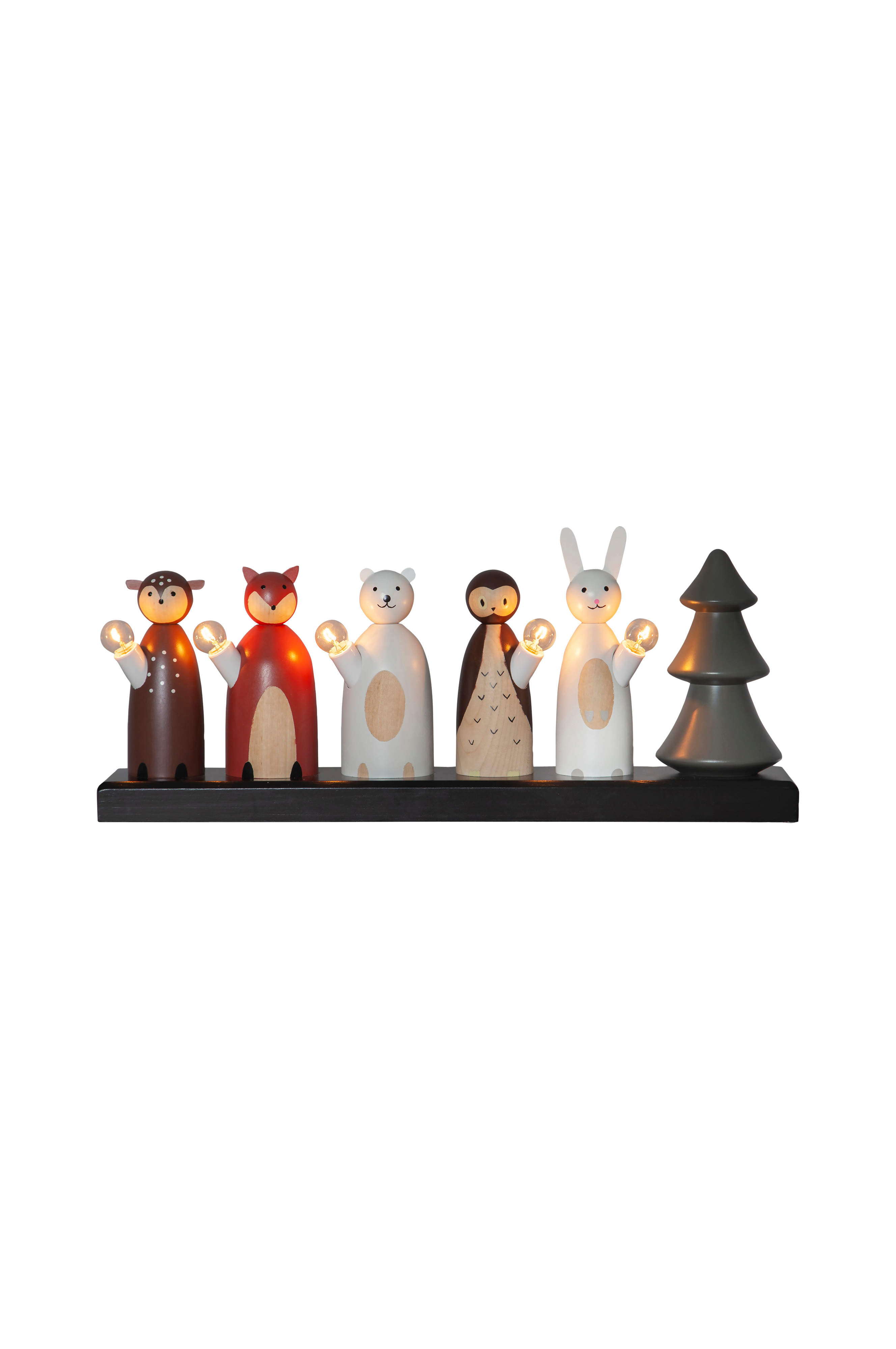 Sähkökynttelikkö, jossa ihanat puiset metsän eläimet. Sähkökynttelikkö luo lämmintä ja viihtyisää joulutunnelmaa. Sijoita ikkunalaudalle, hyllylle tai senkin päälle. Kauris, kettu, jääkarhu, pöllö ja kani seisovat joulukuusen vieressä. Miellyttävä joulukoriste voi olla esillä niin kauan kuin haluat, vaikkapa koko vuoden. Kokonaisteho 15 W. Valonlähteen teho 3 W.