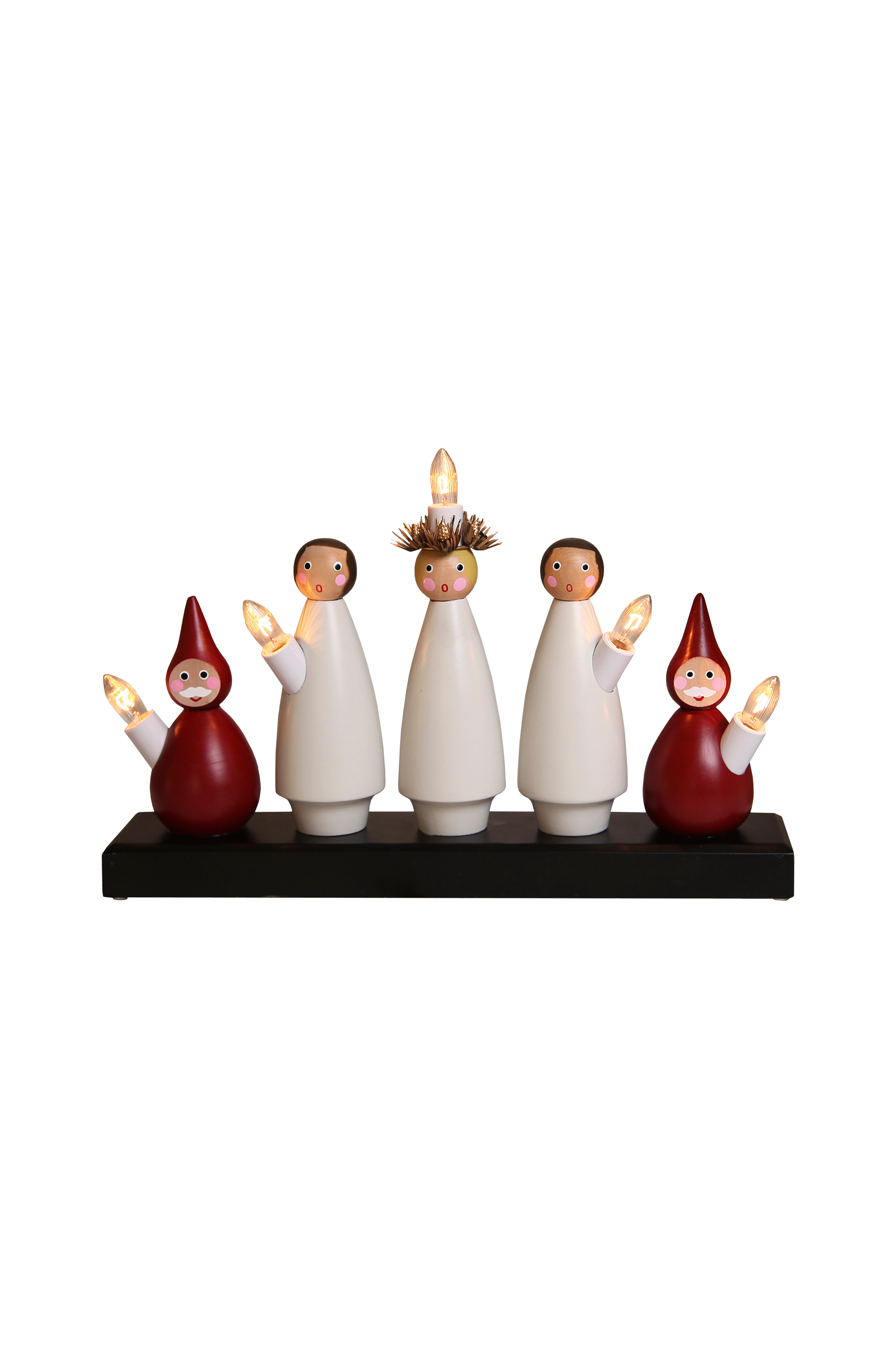 Leveys 33 cm, korkeus 22 cm. Puuta. Lucia-kuoro, 5 kynttilää. Johdon pituus 1,8 metriä.