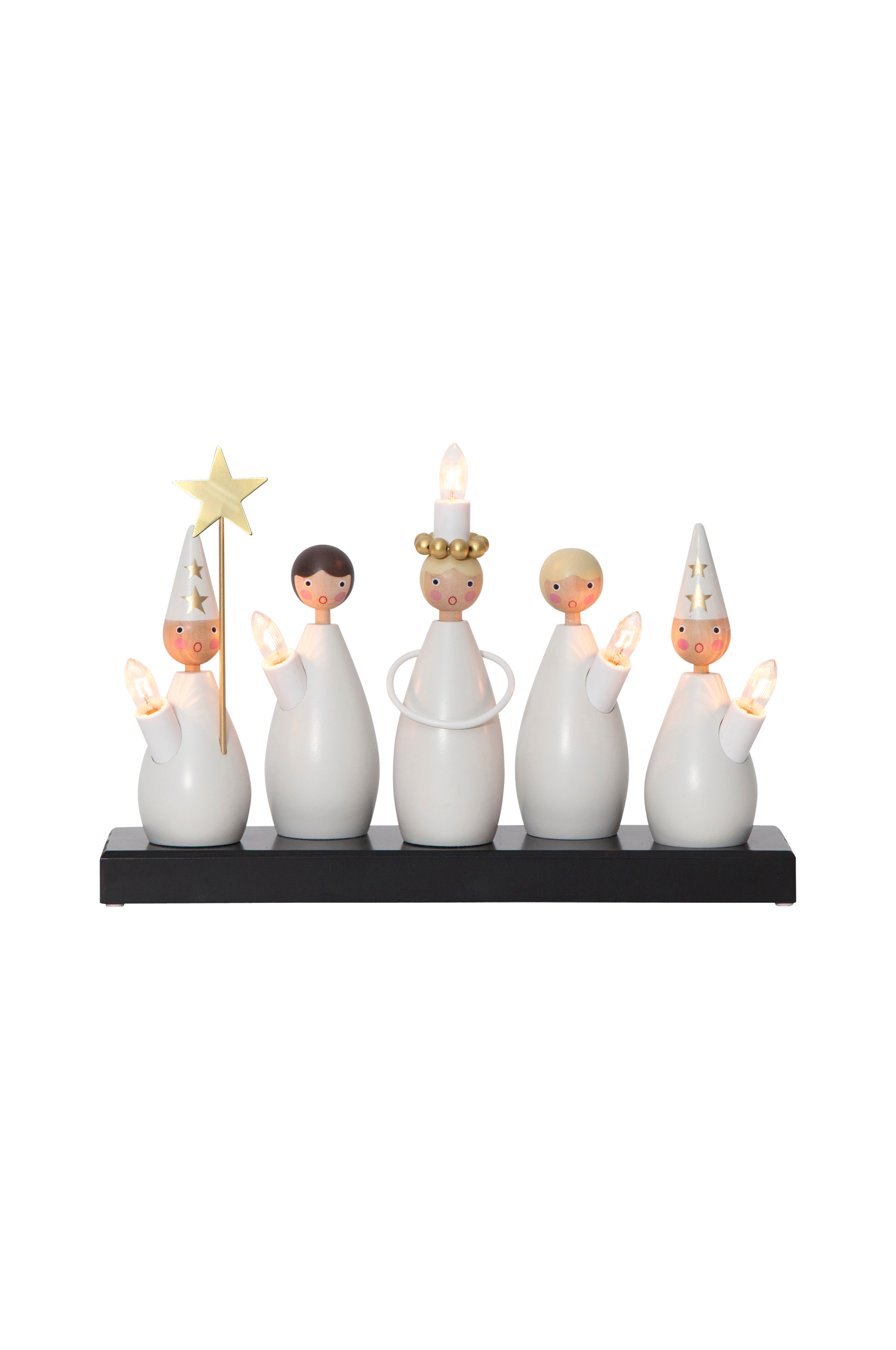 Puinen sähkökynttelikkö, jossa Lucia, kaksi tärna-tyttöä ja kaksi tähtipoikaa. Yhdellä tähtipojalla on kädessään kullanväriseksi maalattu metallitähti. Tähtipojassa on pieni reikä, johon tähden tikun voi asettaa. Tähti on irrallinen, ja se täytyy kiinnittää tikkuun käsin. Lucia-neidolla on päässään kullanväriseksi maalattu puuhelmikranssi. 5 valonlähdettä. Sijoita senkin päälle tai ikkunaan luomaan miellyttävää joulutunnelmaa kotiin. E10-lampunkanta, valonlähteet mukana. Valkoinen johto 180 cm. Korkeus 22 cm, leveys/pituus 33 cm ja syvyys 9 cm.