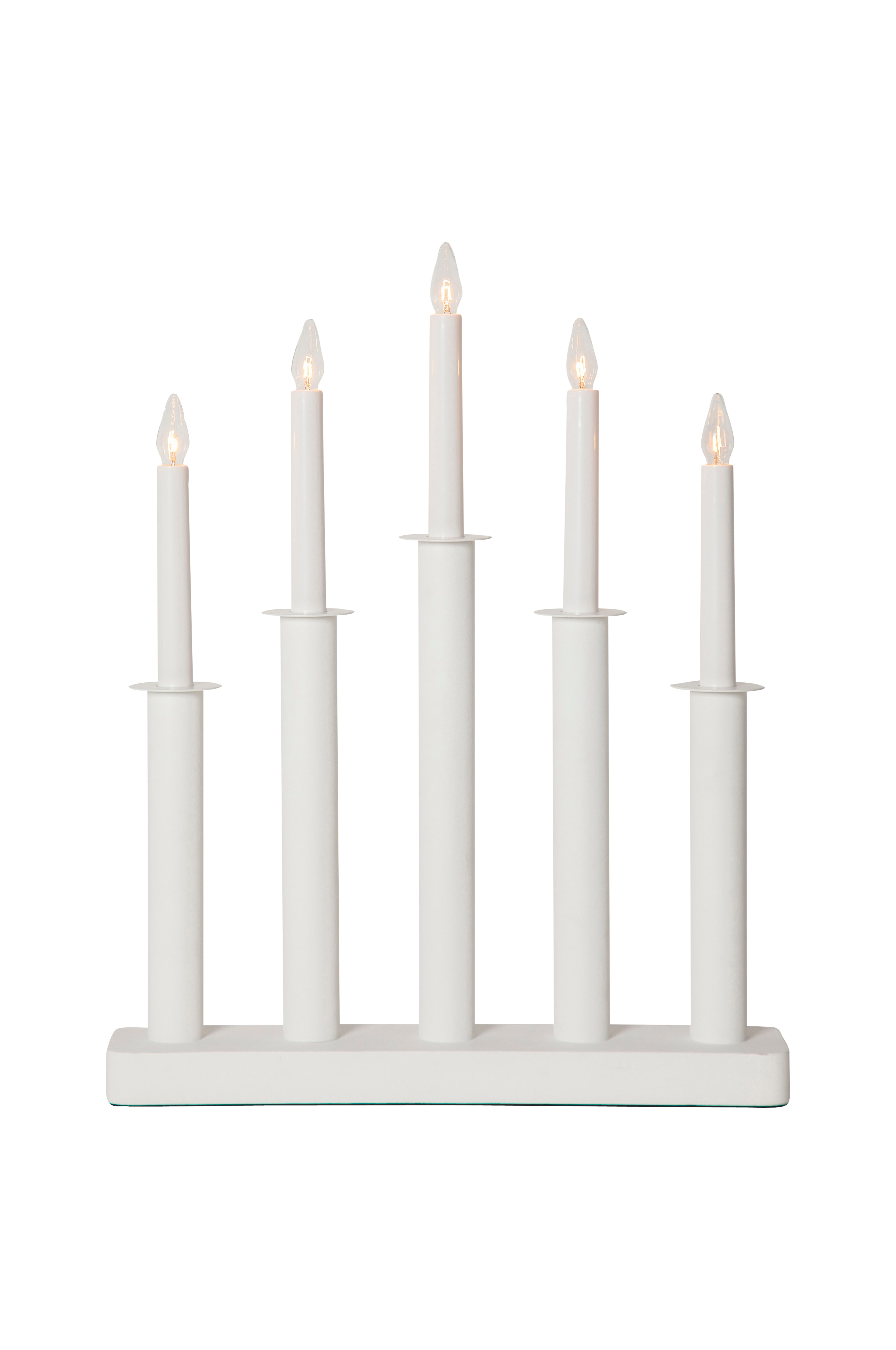Moderni, valkoinen ja puinen sähkökynttelikkö, jossa yhteensopivat metalliset koristeet. Koristele adventiksi ja jouluksi. Aseta ikkunalaudalle tai senkin päälle.